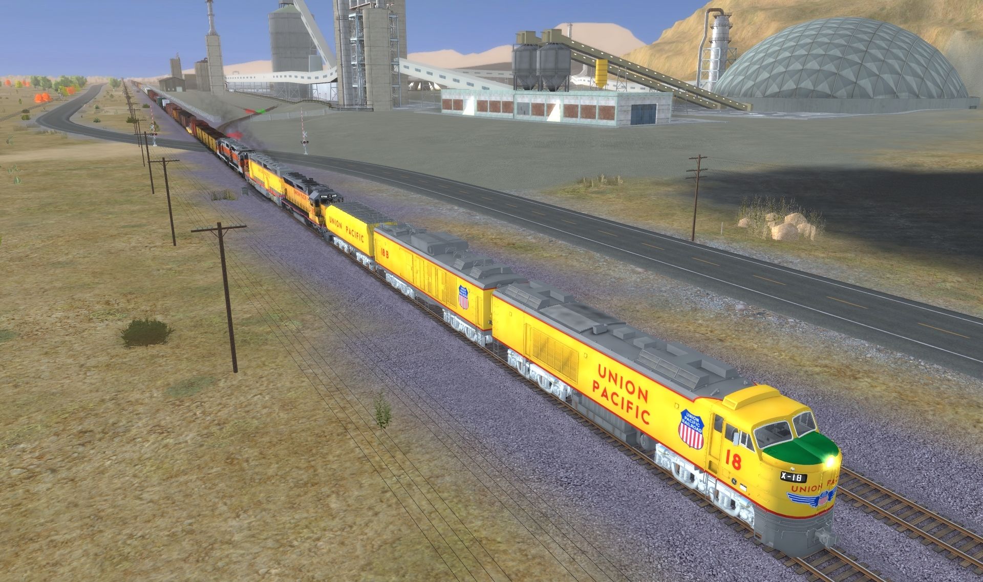 Tags: Trainz: A New Era, Mojave Sub Division, UP GE 8500HP Gas Turbine A-Unit, UP GE 8500HP Gas Turbine B-Unit, SD45(SD40M-2) UP #2789, Union Pacific DD35 B unit #74b, WP GP35 Zephyr 2, SP SD45, UP Auxiliary Tender, PFE R-40-2 Reefer Early, Flatcar 53 ft Union Pacific DES, 40ft Boxcar ATSF Bx-26, 40ft Boxcar C&O