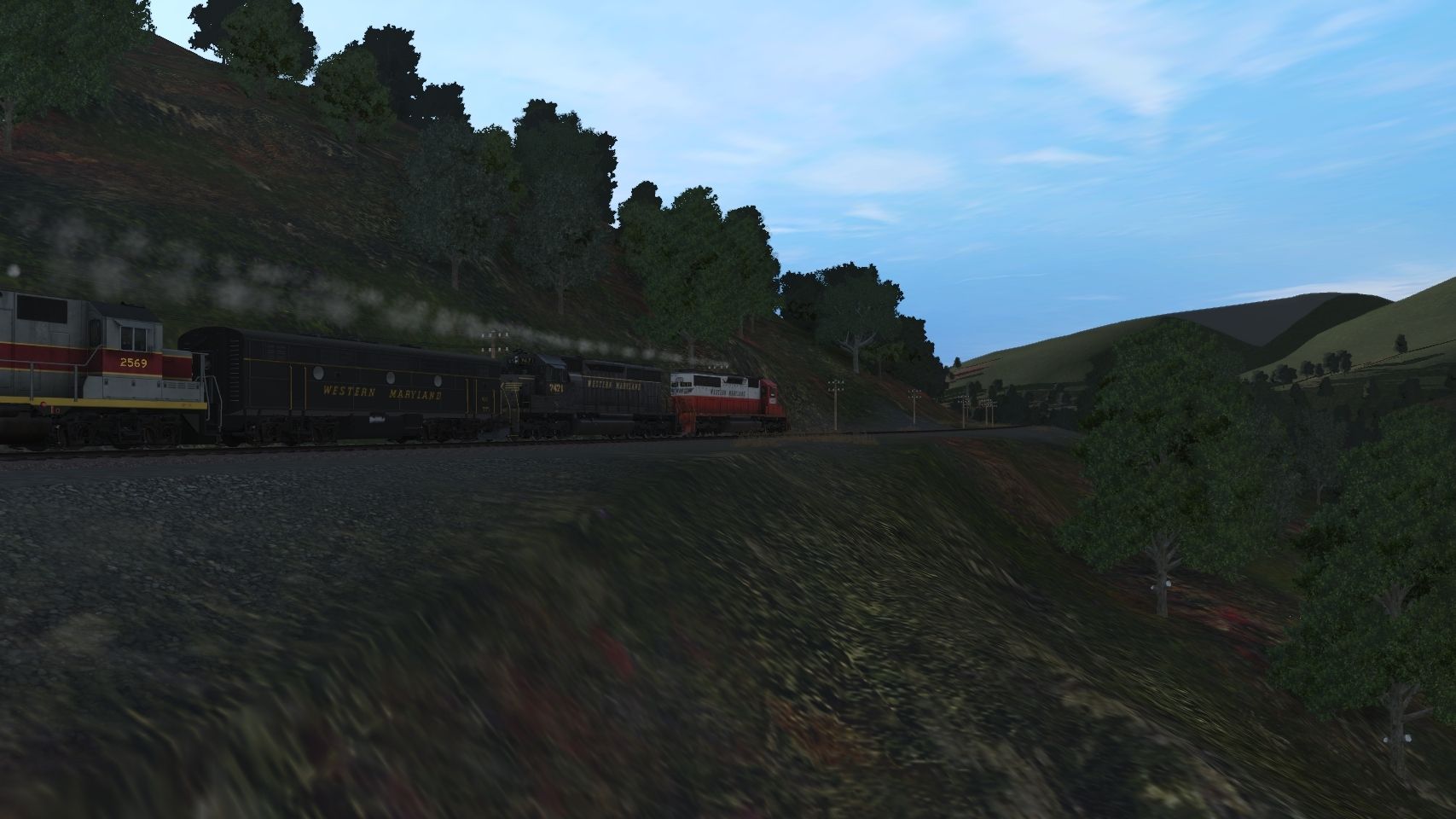 Tags: Trainz Railroad Simulator 2019, Cumberland to Connellsville, Default, EL GP35 early, WM F7B #411, WM SD40 black, WM SD40, Flatcar50ft B&O 2 h#, 50ftBoxcar Nickel Plate DD ins#, 50ft Airslide Hop NP 75946, 50ft Boxcar Allegheny Midland Railroad yt#, 50ft Boxcar AN 2174, 50ft Boxcar Bangor and Aroostook sryt#, Gondola 50ft CNW #bM