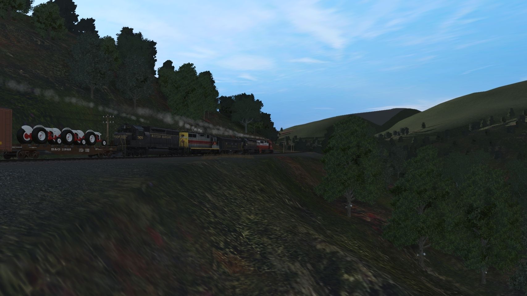 Tags: Trainz Railroad Simulator 2019, Cumberland to Connellsville, Default, EL GP35 early, WM F7B #411, WM SD40 black, WM SD40, 50ft Airslide Hop NP 75946, 50ft Boxcar Allegheny Midland Railroad yt#, 50ftBoxcar Nickel Plate DD ins#, 50ft Boxcar AN 2174, Flatcar50ft B&O 2 h#, 50ft Boxcar Bangor and Aroostook sryt#, Gondola 50ft CNW #bM