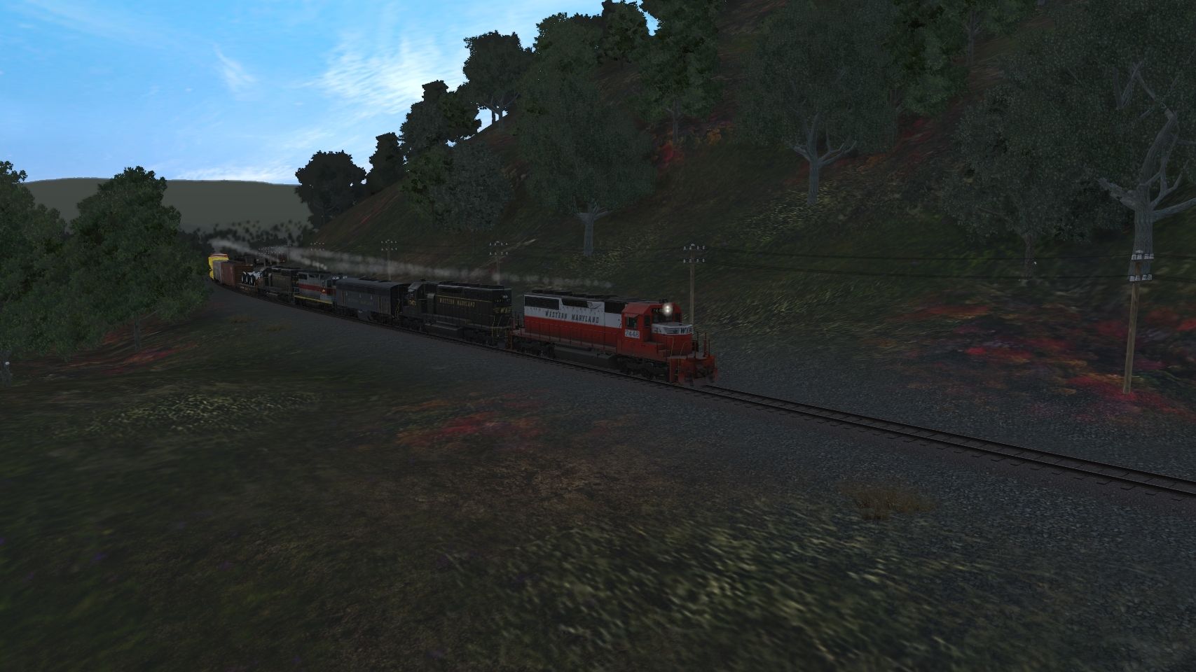 Tags: Trainz Railroad Simulator 2019, Cumberland to Connellsville, Default, WM SD40, WM SD40 black, WM F7B #411, EL GP35 early, Flatcar50ft B&O 2 h#, 50ftBoxcar Nickel Plate DD ins#, 50ft Airslide Hop NP 75946, 50ft Boxcar Allegheny Midland Railroad yt#, 50ft Boxcar AN 2174, 50ft Boxcar Bangor and Aroostook sryt#, Gondola 50ft CNW #bM