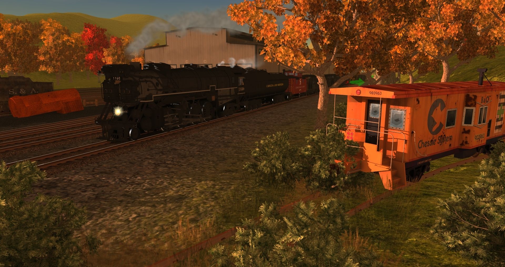 Tags: Trainz: A New Era, Carolina And Western Railroad, Default, CWRY EX-C&O K-2 Mikado Engine, RI GP40 (Maroon/Yellow) Late, CSX ex-Chessie Bay Window Caboose, PC RS1 9944 Dead, CWRY EX-C&O K-2 Mikado Tender, S&A 4-6-2 750 tender, C&O Wood Sheathed Caboose V2, N&W Aux Tender Unlettered, NW 100 Ton Hopper 2, USRA 55T H C&O, ATSF Ce-11 Caboose