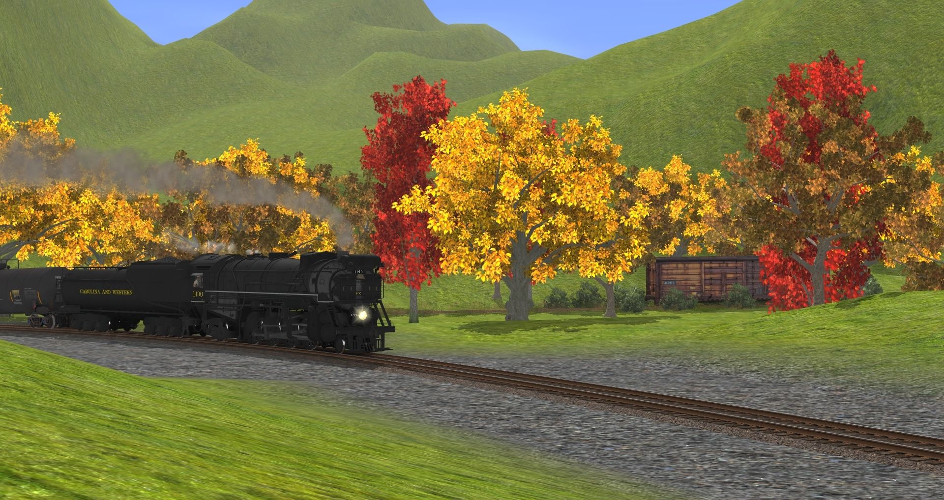 Tags: Trainz: A New Era, Carolina And Western Railroad, Default, CWRY EX-C&O K-2 Mikado Engine, CWRY EX-C&O K-2 Mikado Tender, PROX 23000 gal Funnel-Flow tank car black, NOKL Thrall-Door Boxcar, NS 100 Ton Hopper