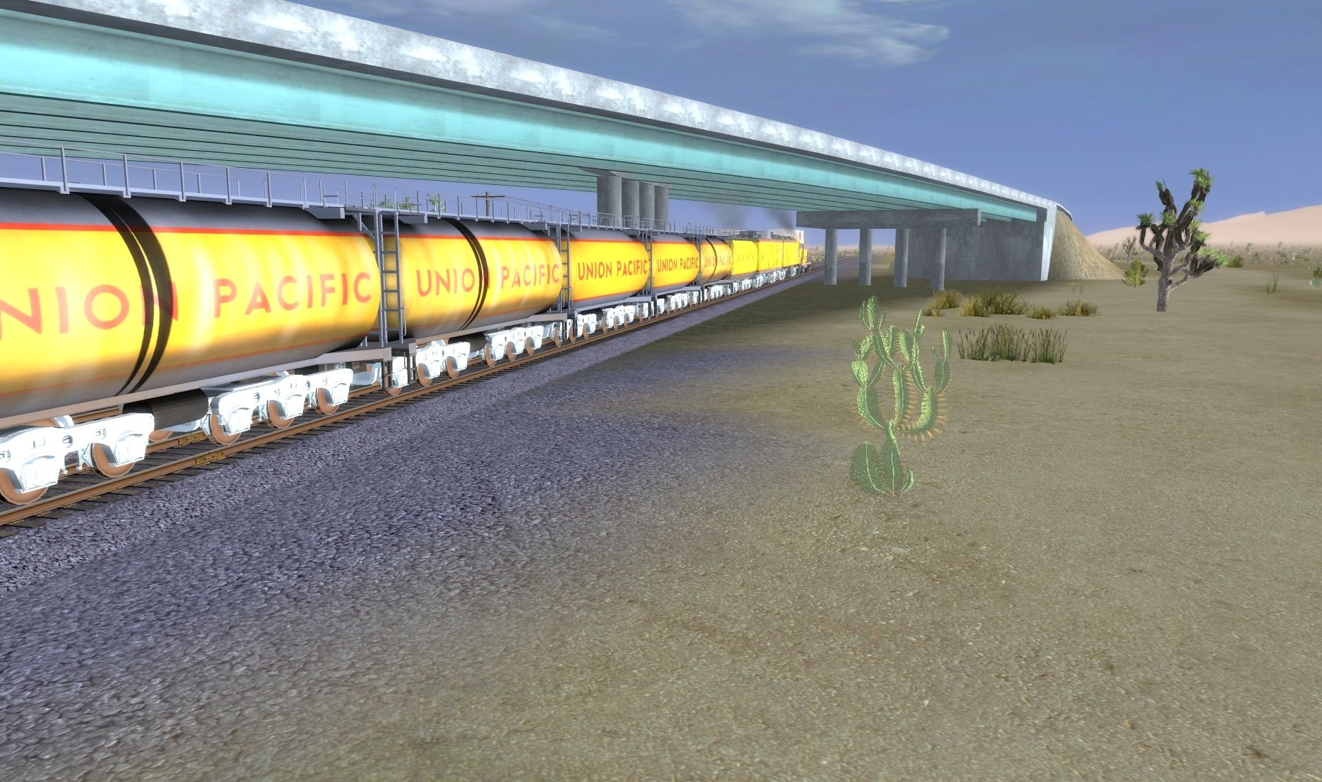 Tags: Trainz: A New Era, Mojave Sub Division, UP GE 8500HP Gas Turbine B-Unit, UP GE 8500HP Gas Turbine A-Unit, Alco RS3 Union Pacific #1292, SF-FP45-001, UP GETL Tender, UP GETL Tender weatherd, UP Auxiliary Tender, UP PS-2 3510, UP PC&F 6033, 40ft Boxcar SSW 01, 40ft Boxcar SSW 36094