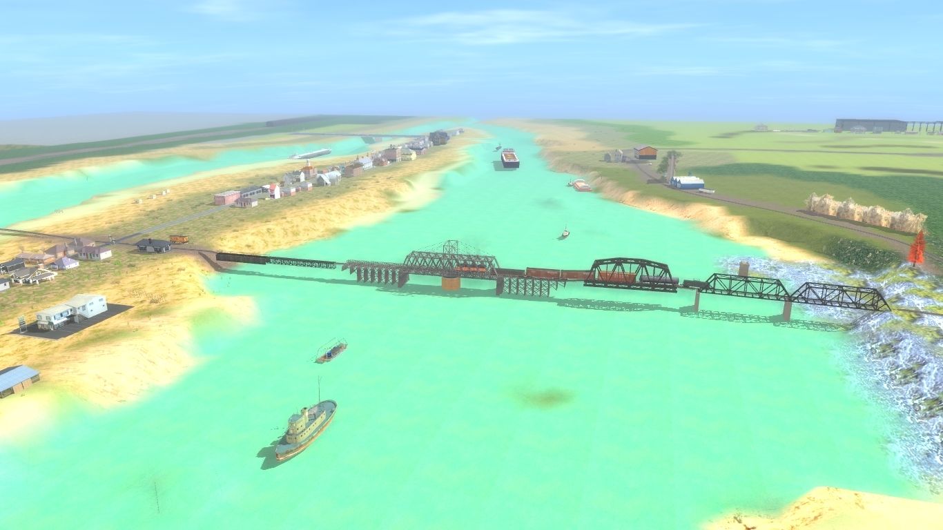 Tags: Trainz: A New Era, Milwaukee Road Iowa/Illinois Subdivision, MILW-GP9-283-001, MILW-Wood-Chip-61ft-filled-01, MILW-Boxcar-50ft-01, Tanker30GalkGATX59600, Tanker 40ft UTLX #, MILW-Boxcar-50ft-03, Mill Gondola 52' Railgon, Caboose Milwaukee 992165 (BW), Barge Grain Open Cover