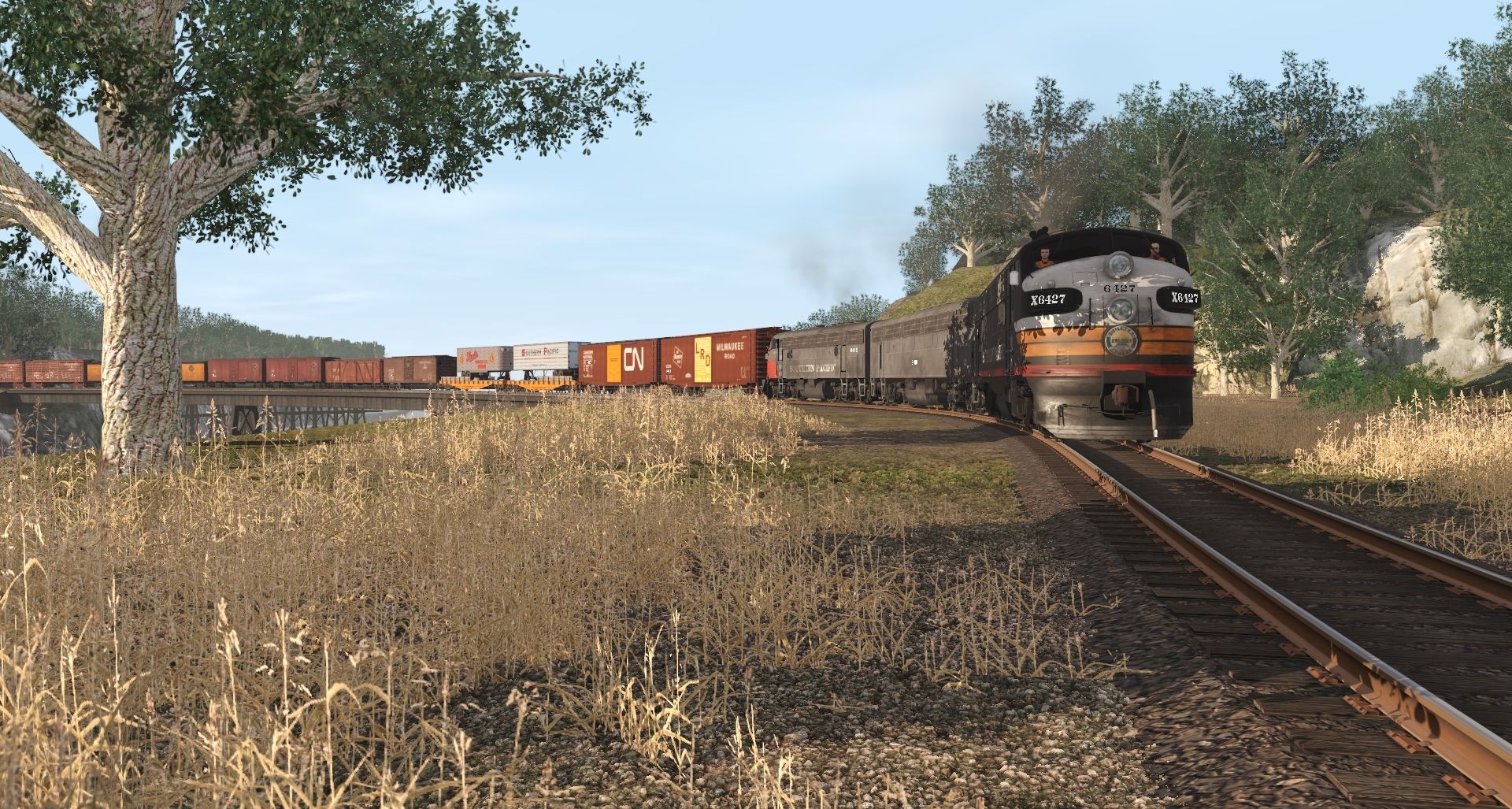 Tags: Trainz Railroad Simulator 2019, Southern Pacific, Default, SP F7A Black Widow Weathered (1950), SP F7B Bloody Nose Weathered, SP F7A Bloody Nose Weathered Plow ND (1958), TUME-300502-Boxcar-50ft-MILW, TUME-300514-Boxcar-50ft-CN, TUME-300594-Trailer-Flatcar-UP, 40ft Boxcar C&O Wood, 40ft Boxcar Fowler BAR 1, 40ft Boxcar SP B-50-20, PFE R-40-2 Reefer Late, 40ft Stockcar C&O 95189 Ant