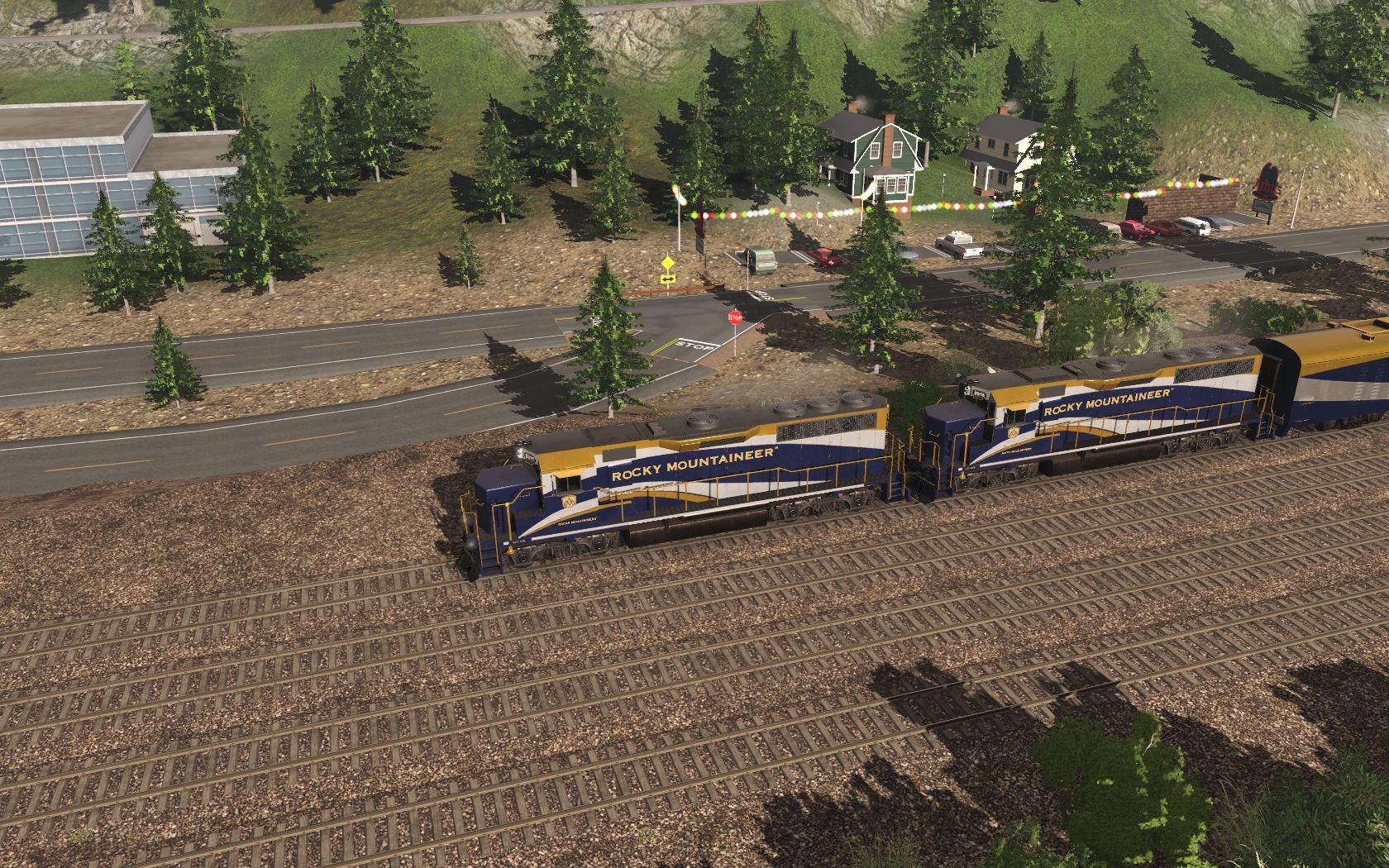 Tags: Trainz Railroad Simulator 2019, Canadian Rocky Mountains - Golden BC, 01 Rocky Mountaineer - Westbound Tourist, RMRX GP40-2, RMRX Baggage/Generator, RMRX 'Red Leaf' Coach, RMRX 'Silver Leaf' Glacier Dome, RMRX 'Gold Leaf' Ultra Dome, BPRR 4 Bay Hopper 2