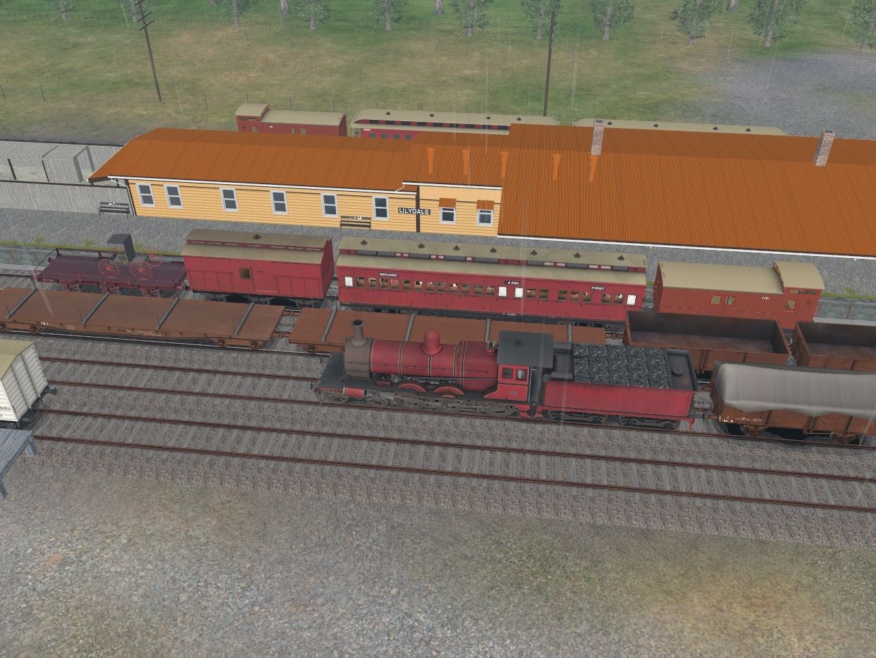Tags: Trainz: A New Era, Healesville - 1913-1920, Down Healesville Mixed, VR DD T2 Can Red W BG, VR E T1 WWI Red - 1918-1924, VR DD T2 Can Red W Ten BG, VR Q Flat T3a - 2, VR ABL T1 1910-1954 carriage, VR Q Flat T3a - 1, VR F Horsebox T6 - BG, VR G Carriage Truck #61 - W, VR AA class American Saloon pass car - 1, VR BB class American Saloon pass car - 1, VR B car 4 wheel BG