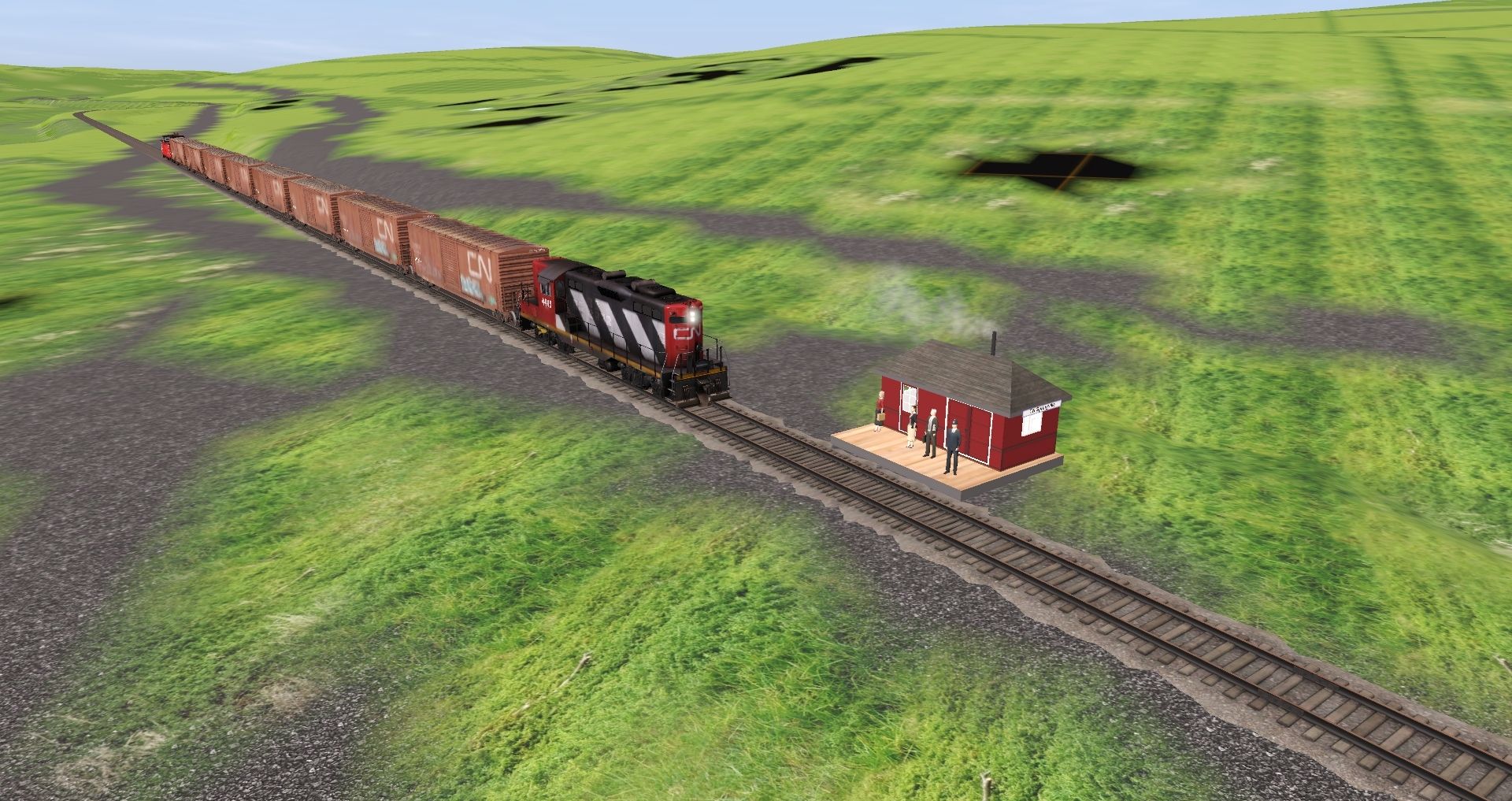 Tags: Trainz Railroad Simulator 2019, SunnybraeSub, Sunnybrae Express, CN GP9 phase II (zebra), CN 50' ACF Boxcar 3, CN 50' ACF Boxcar 2, CN Pointe St Charles Caboose (non-international)