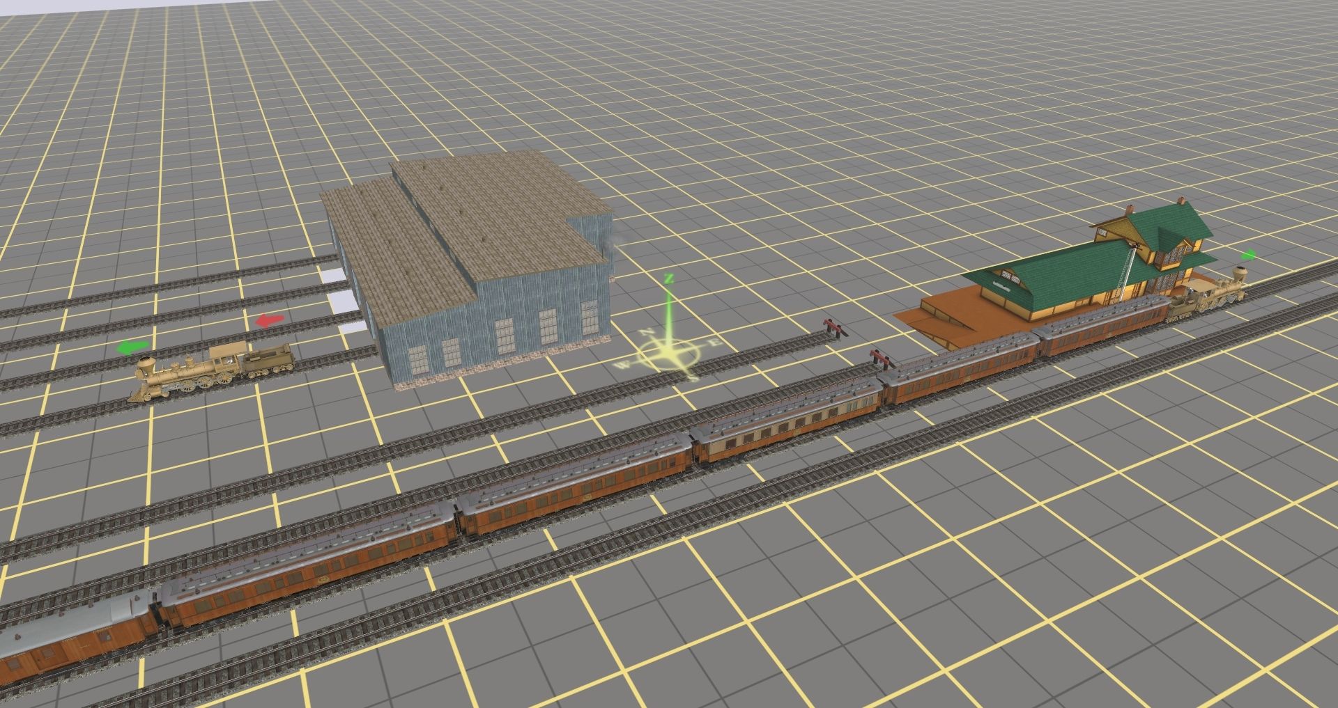 Tags: Trainz: A New Era, Sunny Shores Station, Default, Central Pacific 19 (2nd) Brass, 3DZ OExpress Baggage, 3DZ OExpress Diner, Central Pacific 19 (2nd) Tender Brass, 3DZ OExpress Sleeper