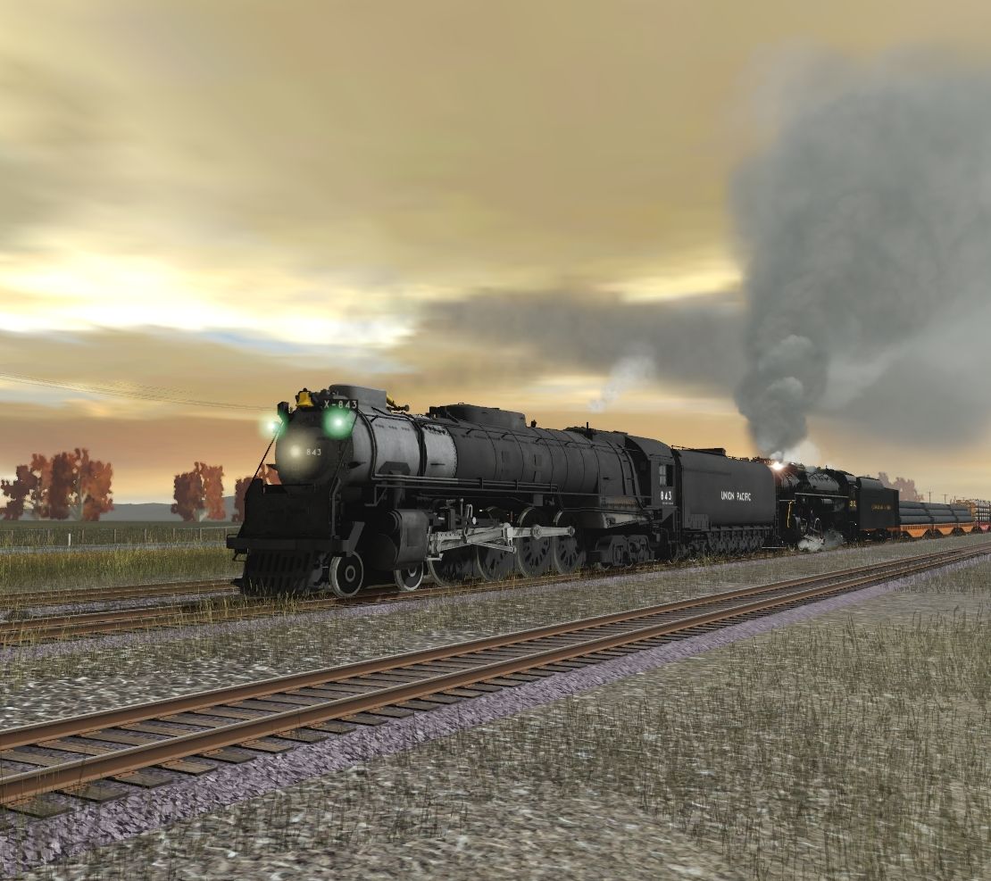 Tags: Trainz Railroad Simulator 2019, Fall Harvest - Nebraska, UP JMB FEF-3 843 V2, C&O Kanawha K-4 Steam, UP JMB FEF Black oil tender, C&O Kanawha K-4 Tender, TUME-300595-Flatcar-UP, TUME-300593-Logging-Flatcar-MILW, TUME-300552-Covered-Hopper-UP, union pacific piggyback car 1, union pacific piggyback car 2, union pacific piggyback car 4, union pacific piggyback car 5