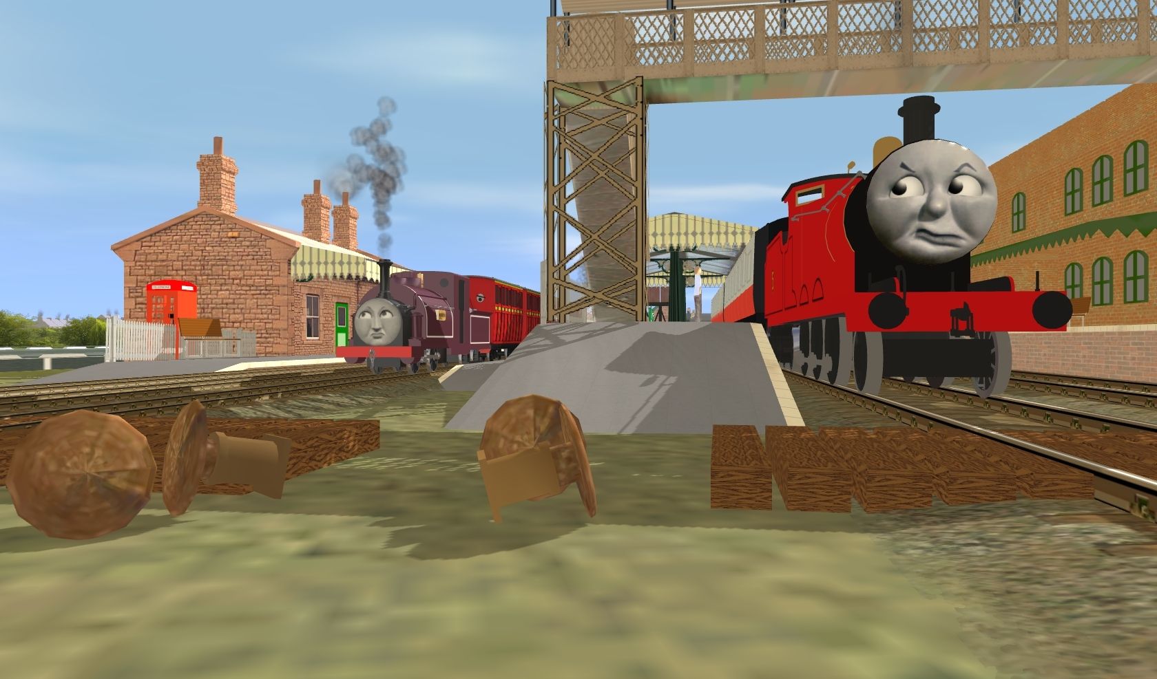 Caption: Palmerston, on of Duke's siblings having an argument with James The Red engine at Crovan's gate.