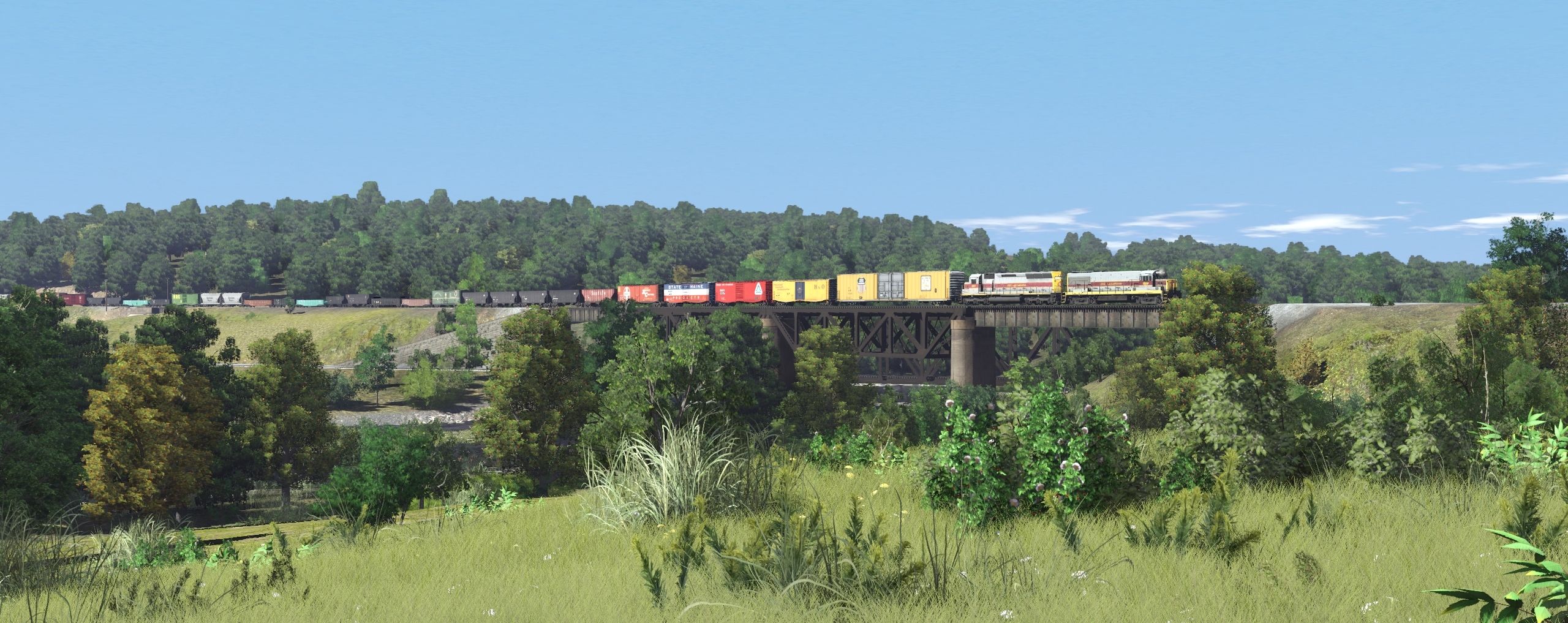 Tags: Trainz Railroad Simulator 2019, EL mahonning Division pre-Alpha, Default, EL U25B late 2513-2527, EL SD45, UP 980050-980090 1971, B&O 50' PS-1, BAR 50' PS-1 2, BAR 50' PS-1, ATSF 50' PS-1, ATSF 100 Ton Hopper (modern era), PC 100 Ton Hopper, NP 50' RBL, NYC Greenville Gondola