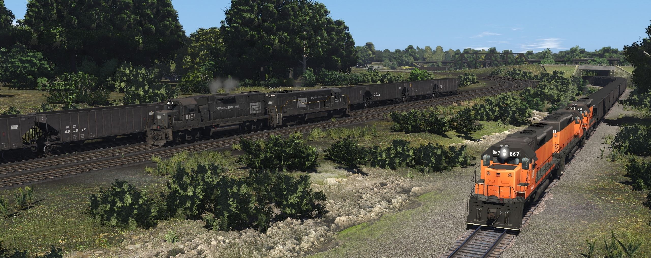 Tags: Trainz Railroad Simulator 2019, EL mahonning Division pre-Alpha, Default, BLE 1973 SD38AC 867, BLE 1973 SD38AC 865, PC GP38-2, PC ex-NH U25B ph4, BLE 1973 SD38 861, BLE 1973 SD9 823, EL SD45, PC 100 Ton Hopper, PRR 100 Ton Hopper, BLE 100 Ton Hopper, G26 gondola Erie