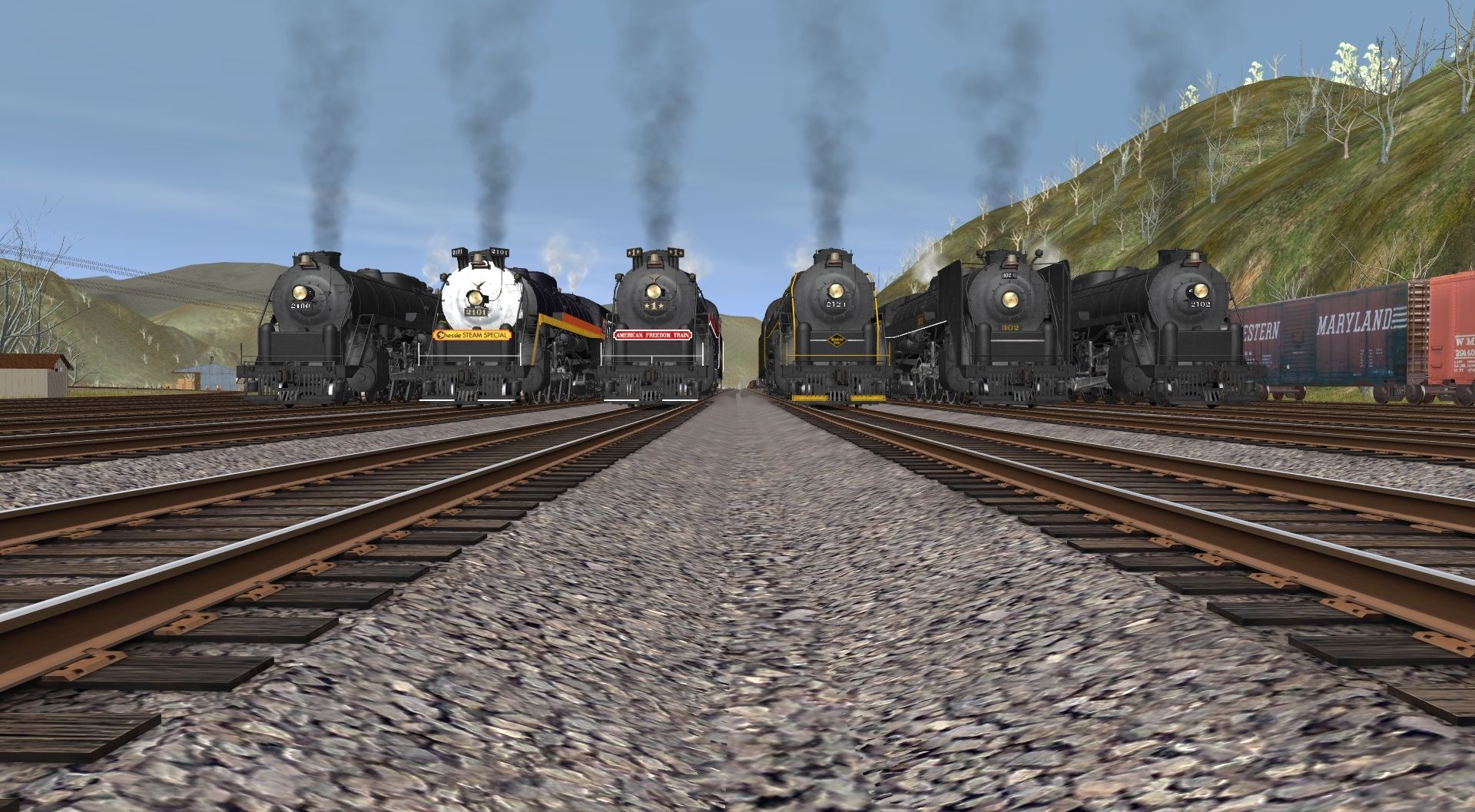 Tags: Trainz: A New Era, C&O Hinton Division, Reading T1 Rambles Engine, AFT T1 Engine, Chessie Steam Special T1 Engine, D&H T1 302 Engine, BM&R T1 Engine, Reading T1 Freight Engine, 40ft C&O AAR boxcar, 40ft Boxcar WRA 01, ATSF Ce-11 Caboose, 40ft Boxcar WM 01, 40ft Boxcar WM #29287