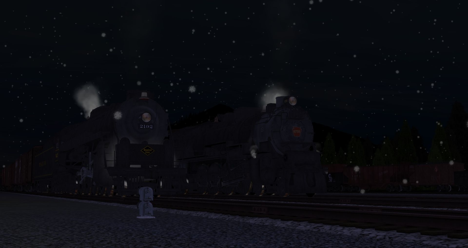 Tags: Trainz: A New Era, Marias Pass Route 1950s, Marias Pass Route 1950s Base Session, Reading T1 Freight Engine, PRR M1b Engine, Great Northern Class S-2 4-8-4, PRR I1sa Engine Post-War, PRR M1b Tender, Reading T1 Freight Tender, B&O 55 Ton Hopper Original, USRA 55T H C&O, 40ft Boxcar Hocking Valley Wood, 40ft Boxcar LE&E Wood War Bonds, 40ft Boxcar Fowler CV
