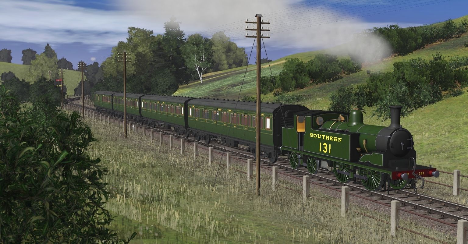 Tags: Trainz Railroad Simulator 2019, Dearnby & District : UK 1900's-1910's Mainline Branchline & Narrow Gauge V2.0, SR Drummond M7 - Olive Green, Metropolitan K Class, SR (ex-LSWR) 54 ft Corridor Composite CK (D1214) - Olive, SR (ex-LSWR) 54 ft Corridor Composite CK (D1225) - Olive, SR (ex-LSWR) 56 ft Corridor Brake Third BTK (RH) - Olive, LMS P2 57' FL (Fully lined), LMS P2 57' C (Fully lined), LMS P2 57' CL (Fully lined), LMS P2 57' BT (Fully lined), NCB 7 plank wagon 1 broken