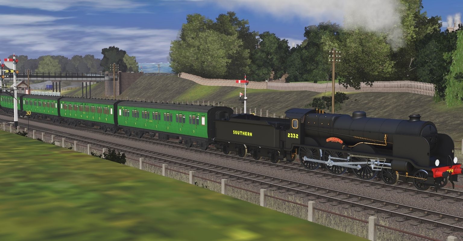 Tags: Trainz Railroad Simulator 2019, Dearnby & District : UK 1900's-1910's Mainline Branchline & Narrow Gauge V2.0, LBSCR N15x Bulleid Black, LBSCR N15x Bulleid Black Tender, SR (ex-LSWR) 56 ft Corridor First FK - Malachite, SR (ex-LSWR) 56 ft Corridor Third TK - Malachite, SR (ex-LSWR) 54 ft Corridor Composite CK (D1214) - Malachite, SR (ex-LSWR) 56 ft Corridor Brake Tri-Composite BCK - Malachite