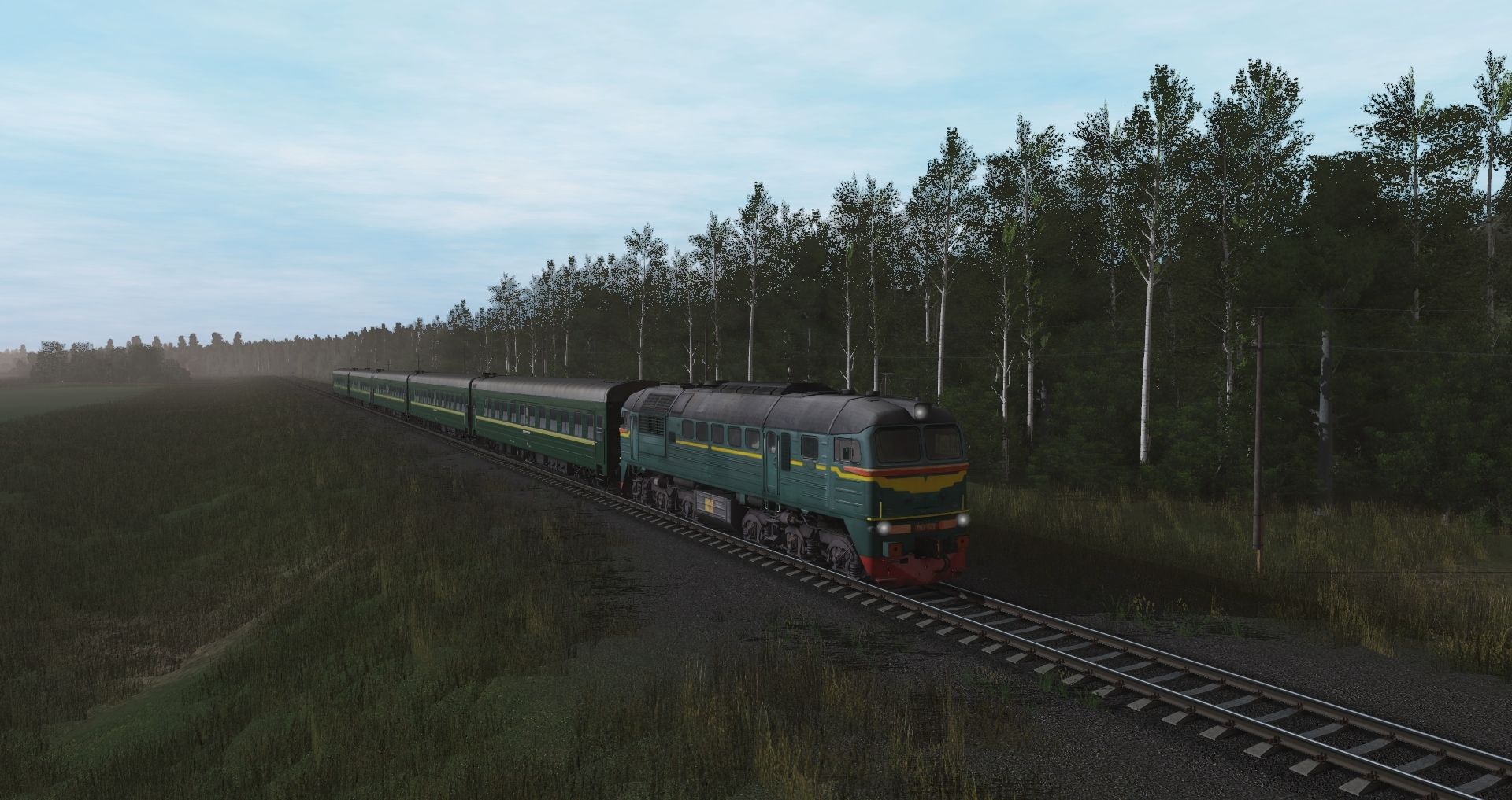 Tags: Trainz Railroad Simulator 2019, Belarusian woodland, №2183 Darovoye - Turov Evening Passenger, M62-1628, SZD kupe Gorky-Tbilisi-13489