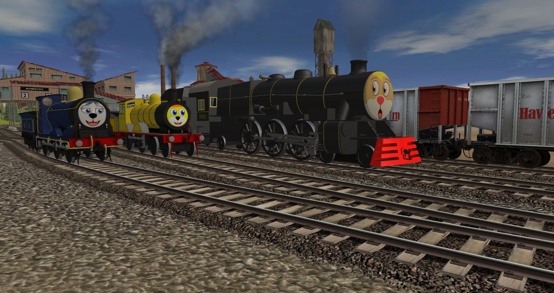 Tags: Trainz: A New Era, Kickstarter County, Freddy P. Bear Lokie, Blue Star lokie, Bartleby Lokie, ATSF B40-8W, Blue Star's Tender, Bartleby's Tender, Freddy's Tender, Custom 100 Ton Hopper - MRM, Custom C80 - Havenwood Southern