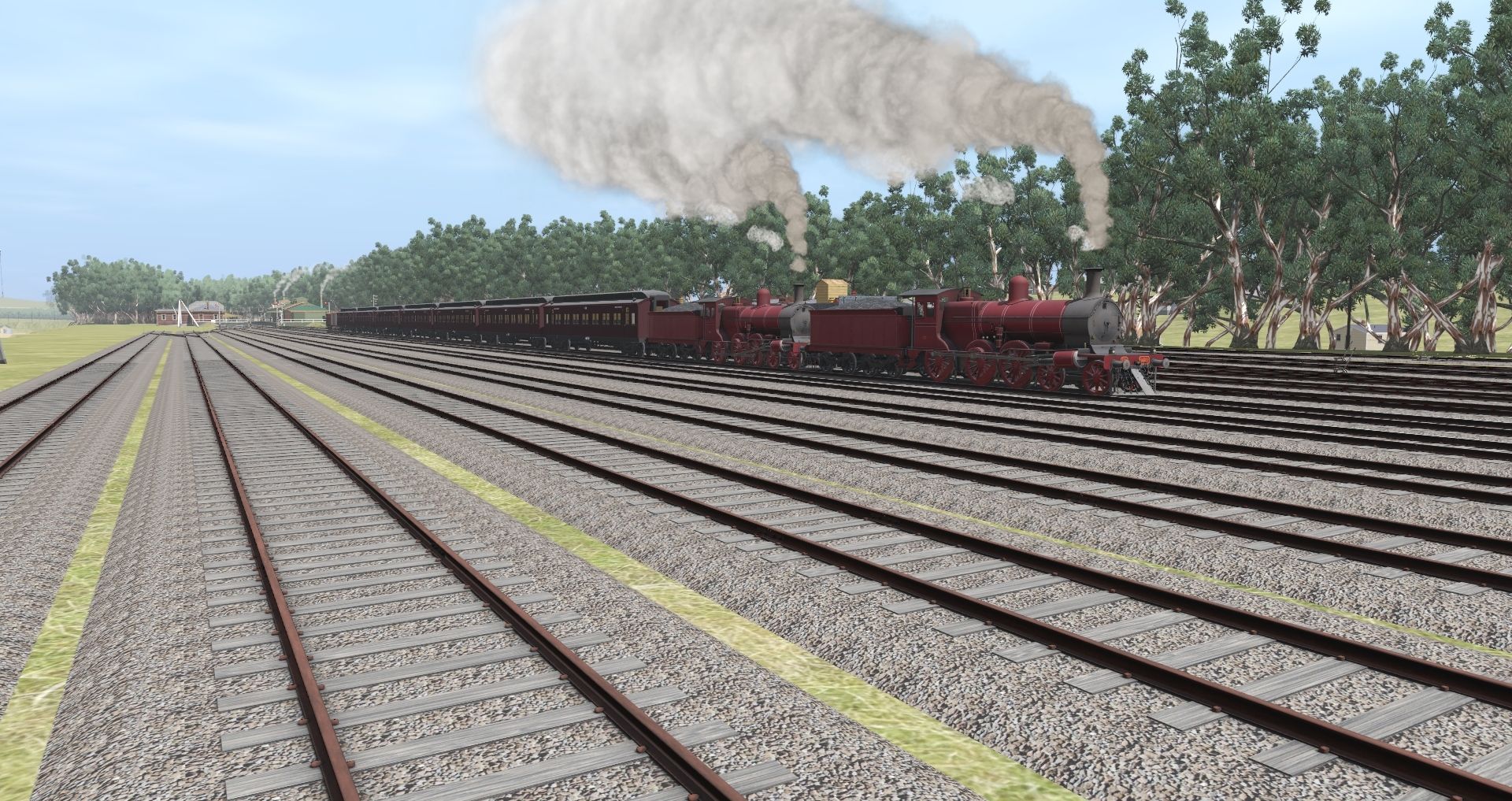 Tags: Trainz Railroad Simulator 2019, Sunshine - Bendigo, Default, VR DD T2 WW1 Red C BG, VR DD T2 WW1 Red C Ten BG, VR BW Crimson Dark/Grey Roof BG, VR ABW Crimson Dark/Grey Roof BG, VR AW Crimson Dark/Grey Roof BG, VR UB T1b - 1934+, VR Z Guards Van T1 1930s-1950s - BG