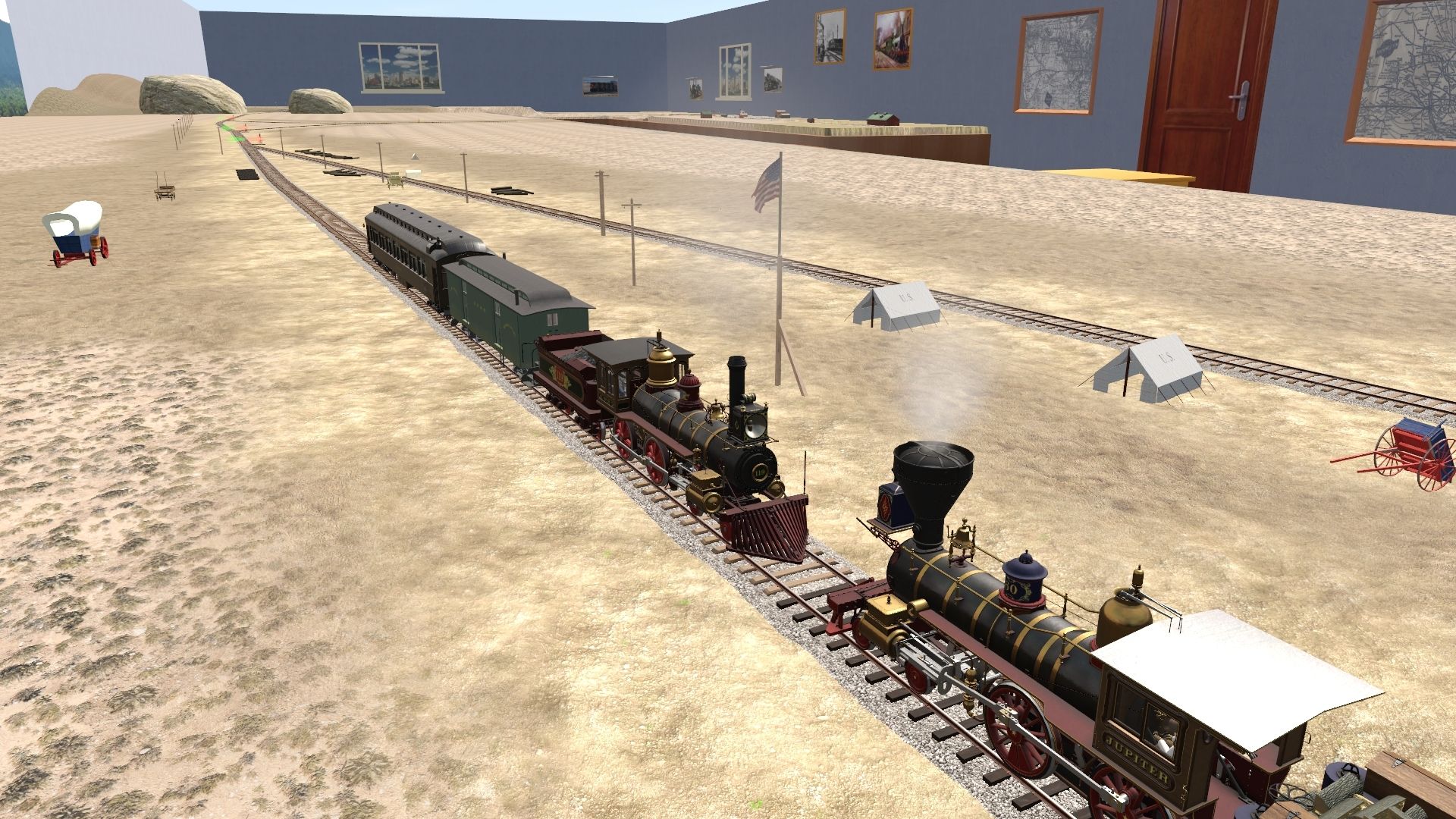 Tags: Trainz Railroad Simulator 2019, Promontory Model layout, trsr - Default, Central Pacific 60 'Jupiter, Union Pacific 119, Central Pacific 62 'Whirlwind, Union Pacific 66, Central Pacific Water Car; Rectangular, Central Pacific 60 Tender, Central Pacific Subsistence Car, Central Pacific Directors Car, Union Pacific 119 Tender, Union Pacific Baggage / Mail Car, UP Harriman Wood Chair Car As Built