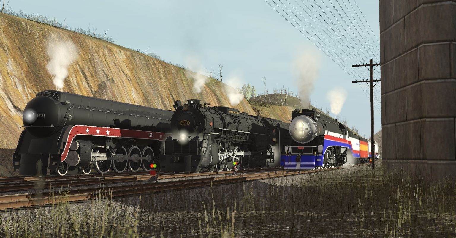 Tags: Trainz Railroad Simulator 2019, C&O Hinton Division, AFT Class J 611, C&O 614 Engine, SP GS-4 #4449 1976 AFT Engine, C&O 614 Tender Excursion, SP GS-4 #4449 1976 AFT Tender, AFT T1 Aux Tender, SP GS-4 #4449 Daylight Auxillary Tender, AFT 01 Tool Car, AFT 02 Trailer Car, AFT 03 Trailer Car, AFT 04 Trailer Car