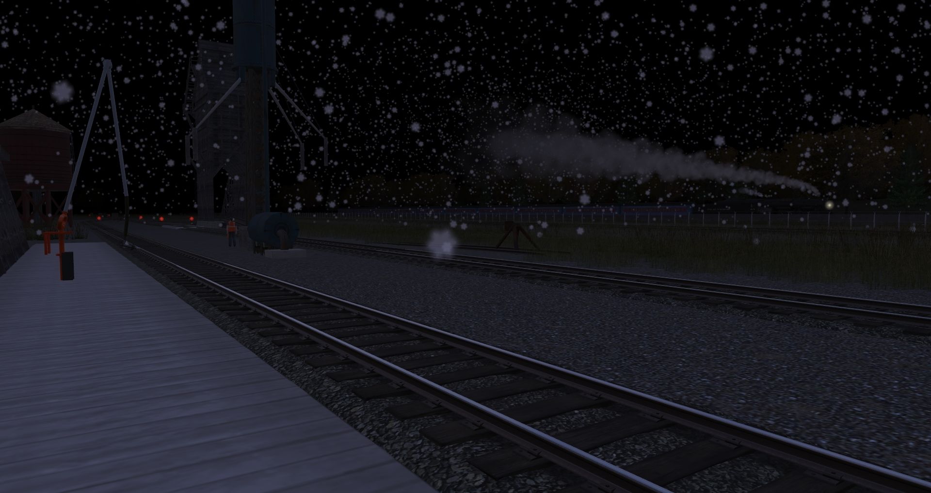 Caption: The Polar Express plows by an engine servicing facility. Later, the engine will visit this spot to refuel on the way back to Grand Rapids.