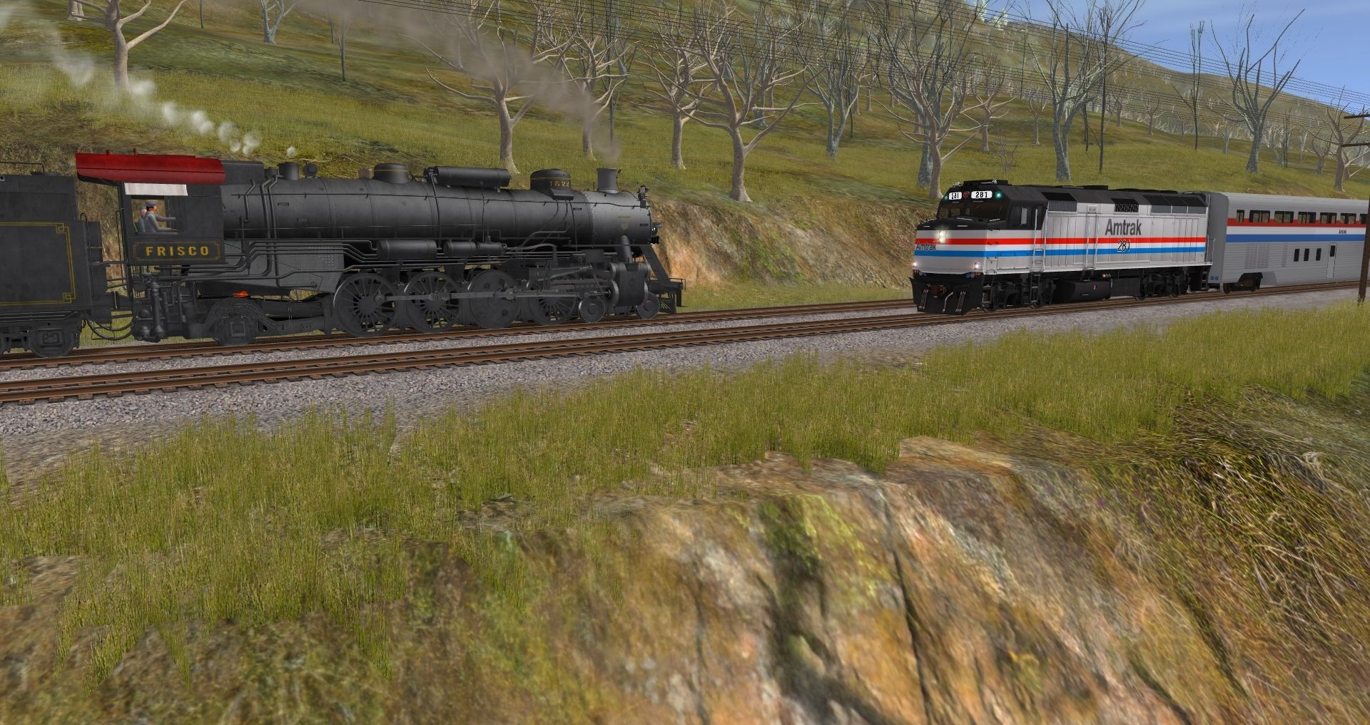 Tags: Trainz: A New Era, C&O Hinton Division, Frisco 1522 Engine, AMTK F40PH ph3, Frisco 1522 Tender, Frisco 1522 Aux Tender, Frisco 1522 01 Tool Car Black Gold, AMTK Hi-Level Chair Car Ph III (Superliner), Frisco 1522 02 Dorm Car Fire Fly, AMTK Hi-Level Chair Car Ph III, Frisco 1522 03 Lounge Chouteau Club, Frisco 1522 04 Business Tail Blue Bonnet