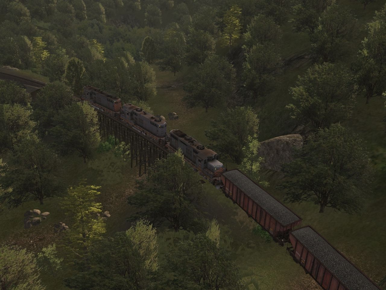 Caption: Coal Service - over old trestle bridge on curve at 15mph