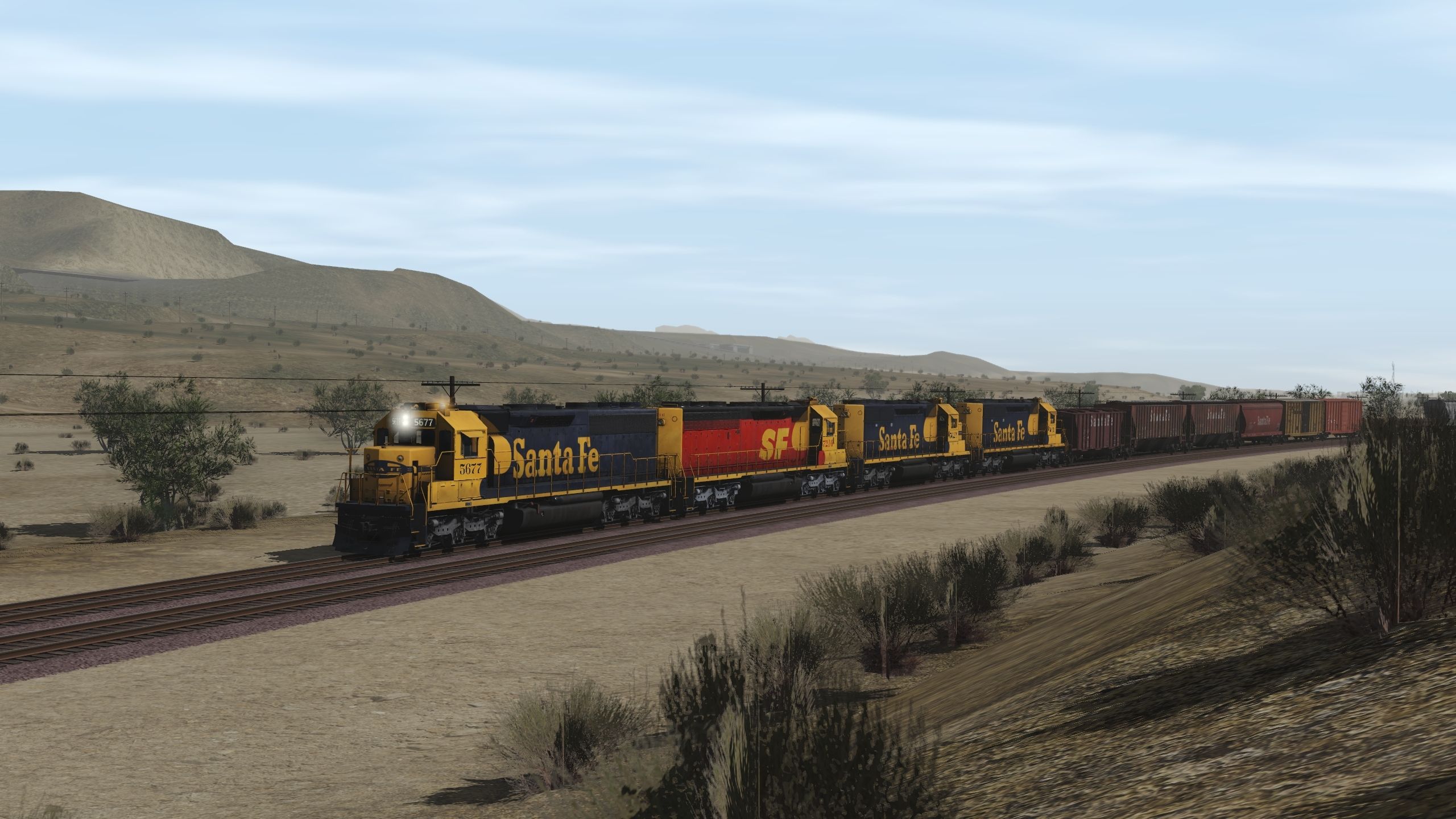 Tags: Trainz Railroad Simulator 2019, Cajon Subdivision - 1990 Part 1: The Pass, Default, ATSF SD45-2 blue/yellow warbonnet, ATSF SD45-2u (SPSF), ATSF SD40-2 2a 123 inch short hood, ATSF SD40-2 2a, ATSF LO 2893, ATSF LO 4750 3 Bay Covered Hopper, ATSF ACF Centerflow 3 Bay long hatch, RBOX P-S 50_6ft Boxcar, MP P-S 50_6ft Boxcar, MP GSC 60ft flatcar, SP 2 Bay Hopper ACF 2971