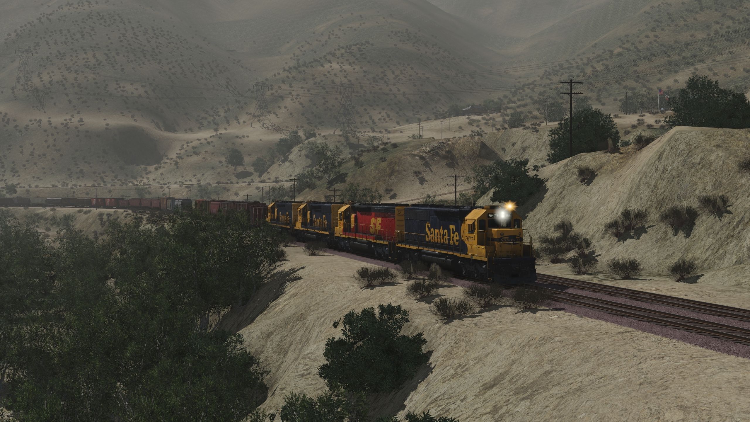 Tags: Trainz Railroad Simulator 2019, Cajon Subdivision - 1990 Part 1: The Pass, Default, ATSF SD45-2 blue/yellow warbonnet, ATSF SD45-2u (SPSF), ATSF SD40-2 2a 123 inch short hood, ATSF SD40-2 2a, ATSF LO 2893, ATSF LO 4750 3 Bay Covered Hopper, ATSF ACF Centerflow 3 Bay long hatch, RBOX P-S 50_6ft Boxcar, MP P-S 50_6ft Boxcar, MP GSC 60ft flatcar, SP 2 Bay Hopper ACF 2971