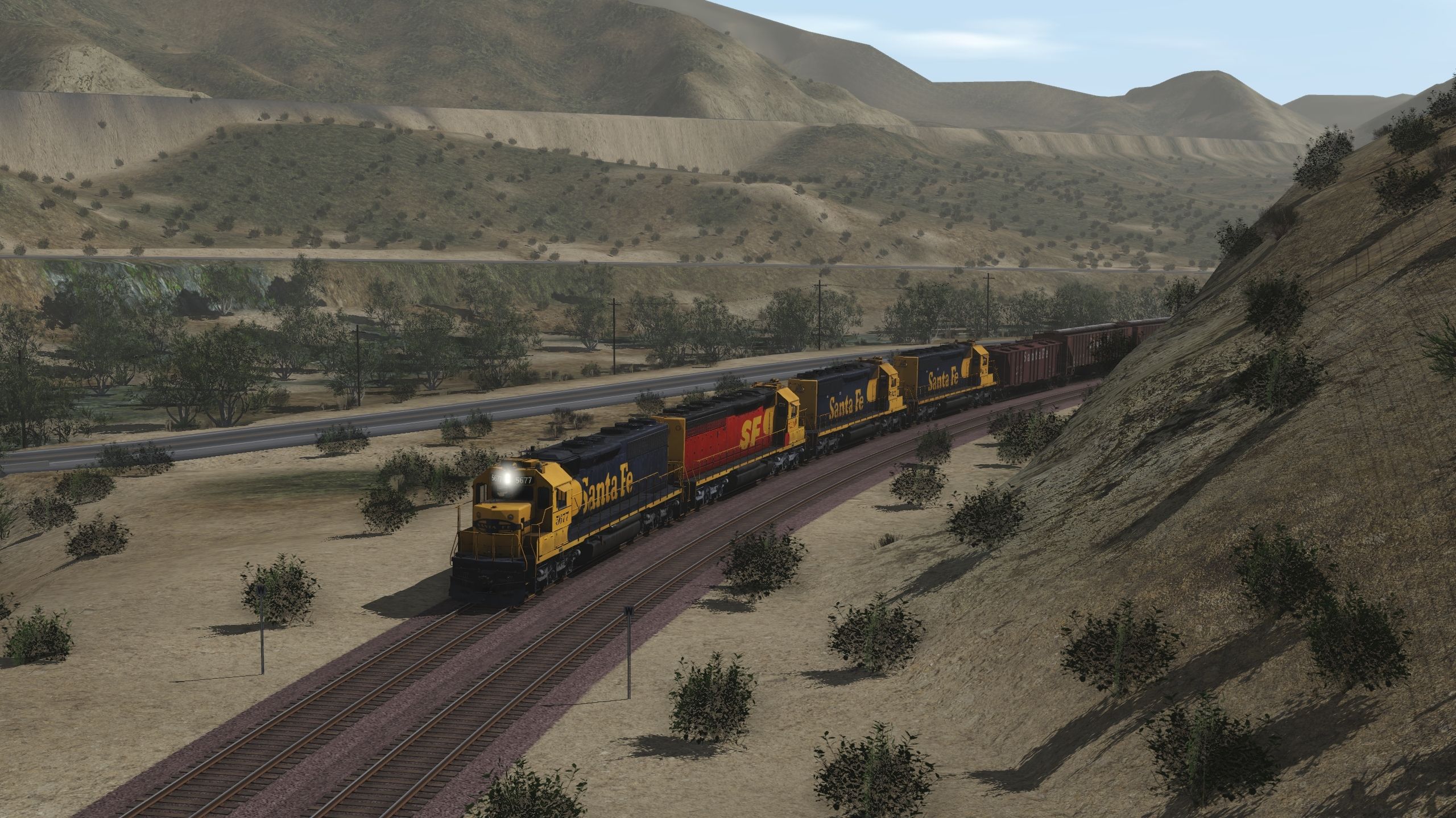 Tags: Trainz Railroad Simulator 2019, Cajon Subdivision - 1990 Part 1: The Pass, Default, ATSF SD45-2 blue/yellow warbonnet, ATSF SD45-2u (SPSF), ATSF SD40-2 2a 123 inch short hood, ATSF SD40-2 2a, SP SD40T-2 ph2a M, SP SD45T-2 ph1a (SPSF), SP SD45T-2 ph1a, ATSF LO 2893, ATSF LO 4750 3 Bay Covered Hopper, ATSF ACF Centerflow 3 Bay long hatch, RBOX P-S 50_6ft Boxcar