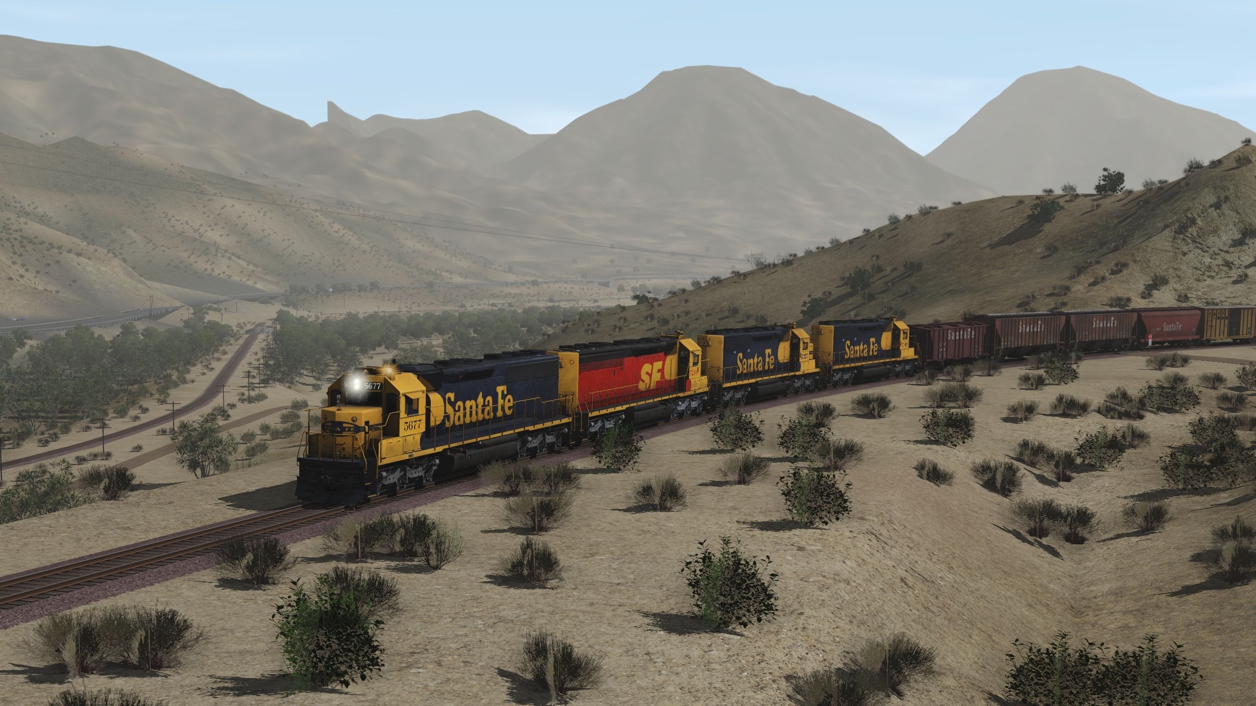 Tags: Trainz Railroad Simulator 2019, Cajon Subdivision - 1990 Part 1: The Pass, Default, ATSF SD45-2 blue/yellow warbonnet, ATSF SD45-2u (SPSF), ATSF SD40-2 2a 123 inch short hood, ATSF SD40-2 2a, ATSF LO 2893, ATSF LO 4750 3 Bay Covered Hopper, ATSF ACF Centerflow 3 Bay long hatch, RBOX P-S 50_6ft Boxcar, MP P-S 50_6ft Boxcar, MP GSC 60ft flatcar, SP 2 Bay Hopper ACF 2971