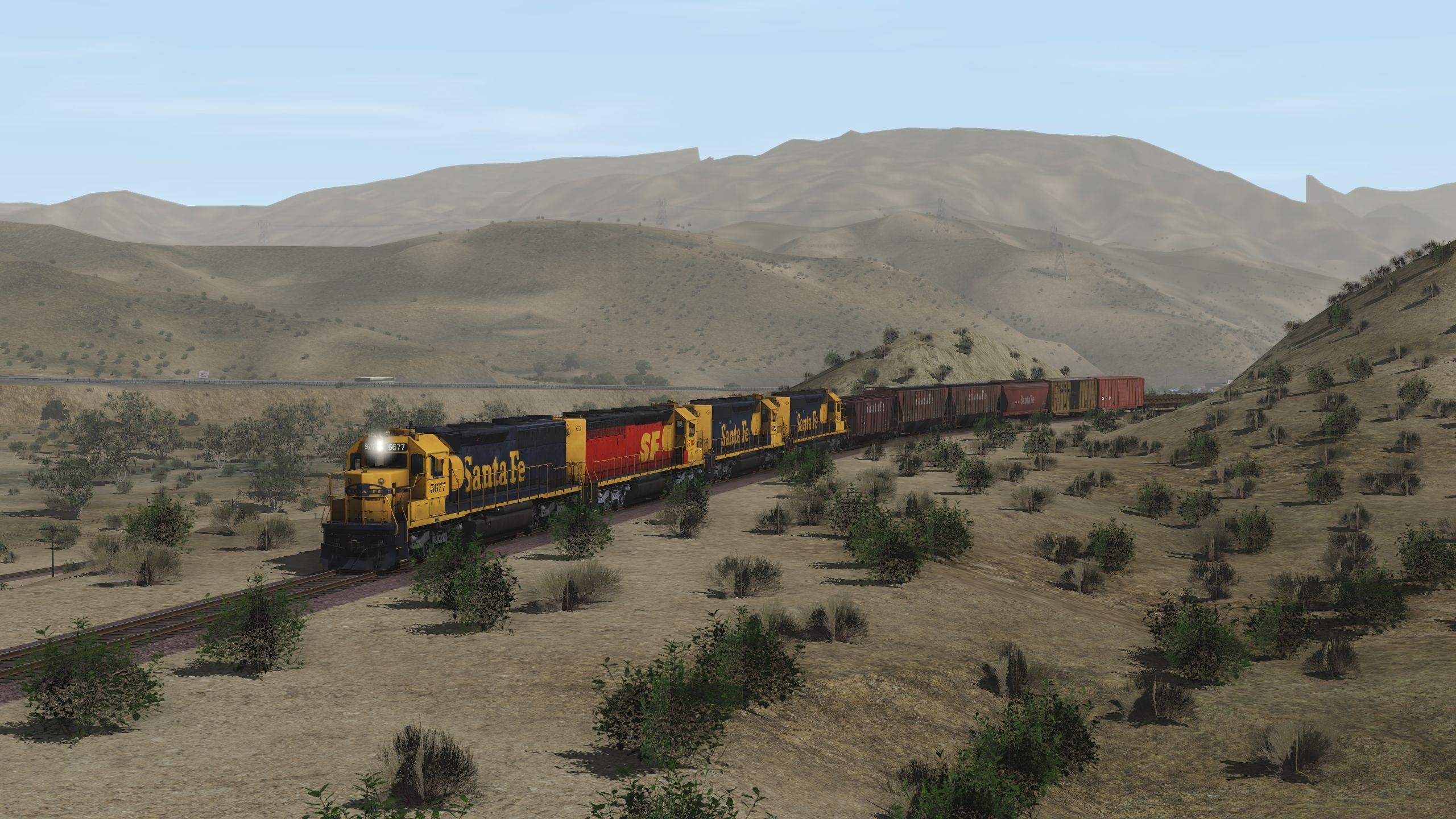Tags: Trainz Railroad Simulator 2019, Cajon Subdivision - 1990 Part 1: The Pass, Default, ATSF SD45-2 blue/yellow warbonnet, ATSF SD45-2u (SPSF), ATSF SD40-2 2a 123 inch short hood, ATSF SD40-2 2a, ATSF LO 2893, ATSF LO 4750 3 Bay Covered Hopper, ATSF ACF Centerflow 3 Bay long hatch, RBOX P-S 50_6ft Boxcar, MP P-S 50_6ft Boxcar, MP GSC 60ft flatcar, SP 2 Bay Hopper ACF 2971