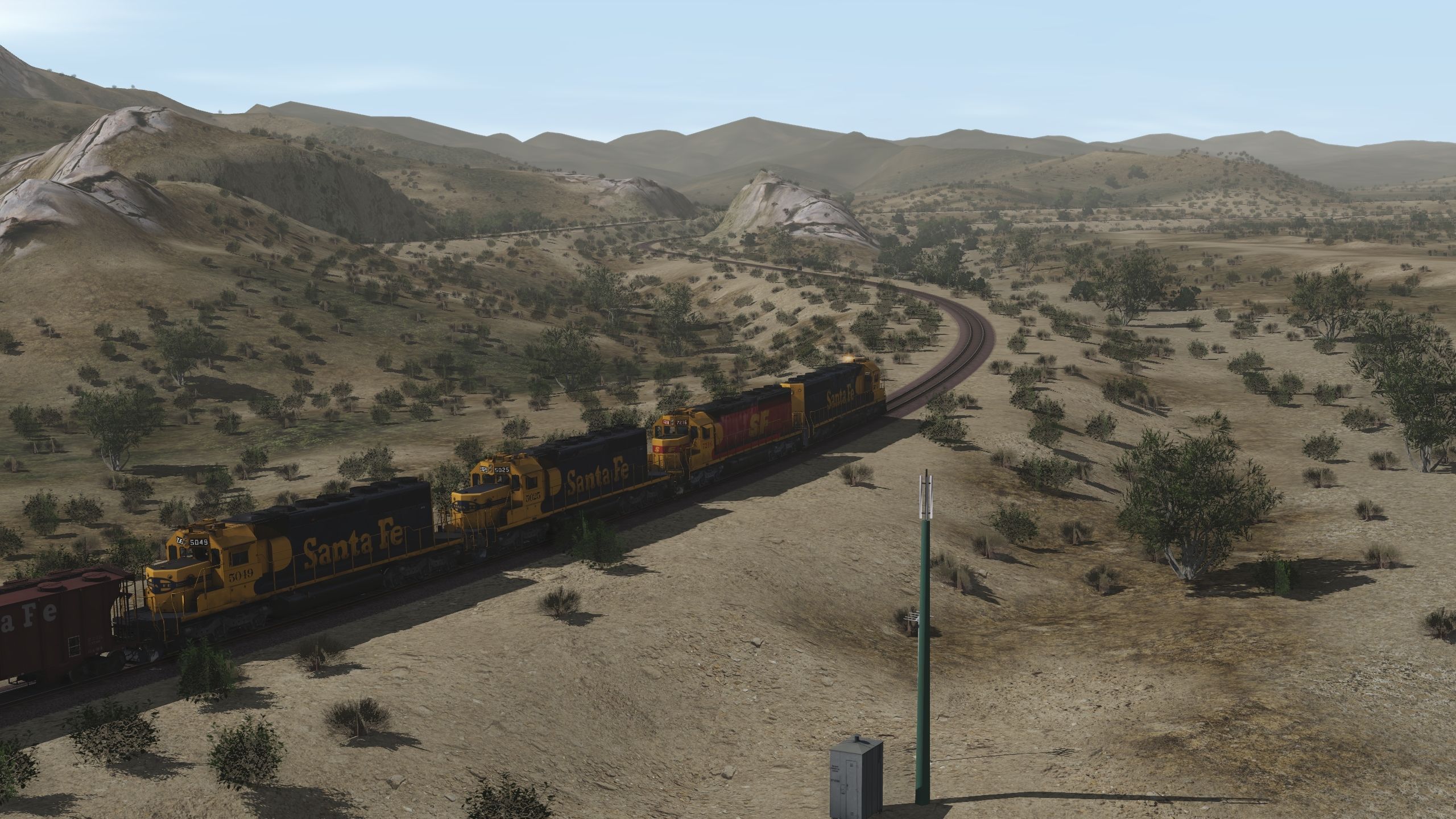 Tags: Trainz Railroad Simulator 2019, Cajon Subdivision - 1990 Part 1: The Pass, Default, ATSF SD40-2 2a, ATSF SD40-2 2a 123 inch short hood, ATSF SD45-2u (SPSF), ATSF SD45-2 blue/yellow warbonnet, ATSF LO 4750 3 Bay Covered Hopper, ATSF ACF Centerflow 3 Bay long hatch, ATSF LO 2893, RBOX P-S 50_6ft Boxcar, MP P-S 50_6ft Boxcar, MP GSC 60ft flatcar, SP 2 Bay Hopper ACF 2971