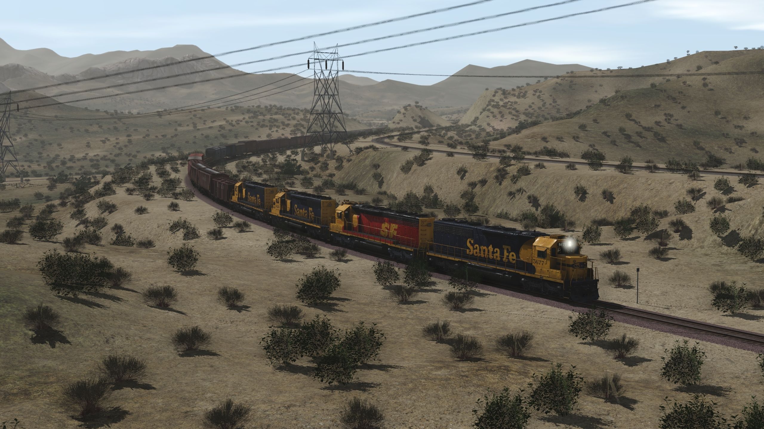 Tags: Trainz Railroad Simulator 2019, Cajon Subdivision - 1990 Part 1: The Pass, Default, ATSF SD45-2 blue/yellow warbonnet, ATSF SD45-2u (SPSF), ATSF SD40-2 2a 123 inch short hood, ATSF SD40-2 2a, ATSF LO 2893, ATSF LO 4750 3 Bay Covered Hopper, ATSF ACF Centerflow 3 Bay long hatch, RBOX P-S 50_6ft Boxcar, MP P-S 50_6ft Boxcar, MP GSC 60ft flatcar, SP 2 Bay Hopper ACF 2971