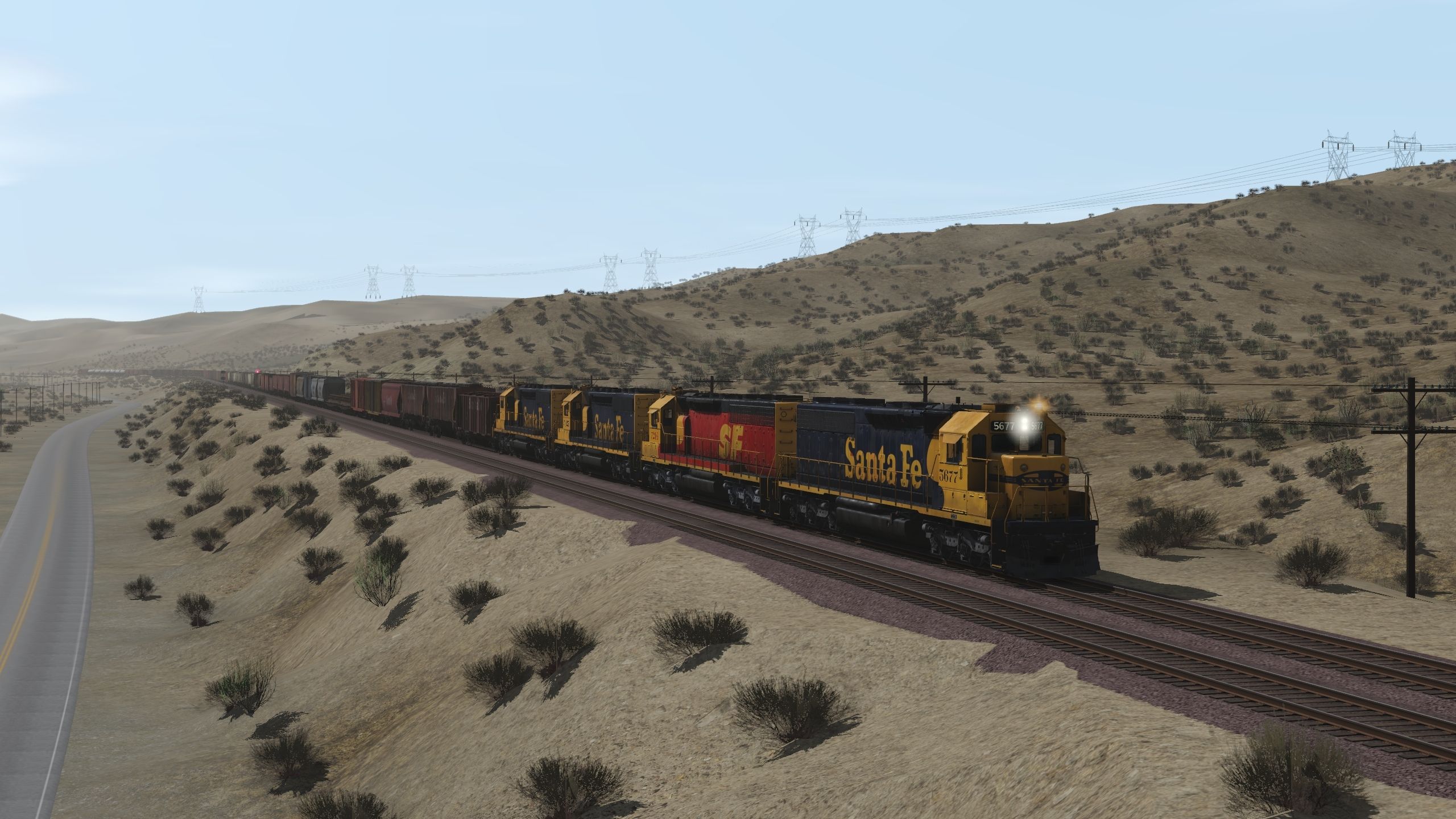 Tags: Trainz Railroad Simulator 2019, Cajon Subdivision - 1990 Part 1: The Pass, Default, ATSF SD45-2 blue/yellow warbonnet, ATSF SD45-2u (SPSF), ATSF SD40-2 2a 123 inch short hood, ATSF SD40-2 2a, ATSF LO 2893, ATSF LO 4750 3 Bay Covered Hopper, ATSF ACF Centerflow 3 Bay long hatch, RBOX P-S 50_6ft Boxcar, MP P-S 50_6ft Boxcar, MP GSC 60ft flatcar, SP 2 Bay Hopper ACF 2971