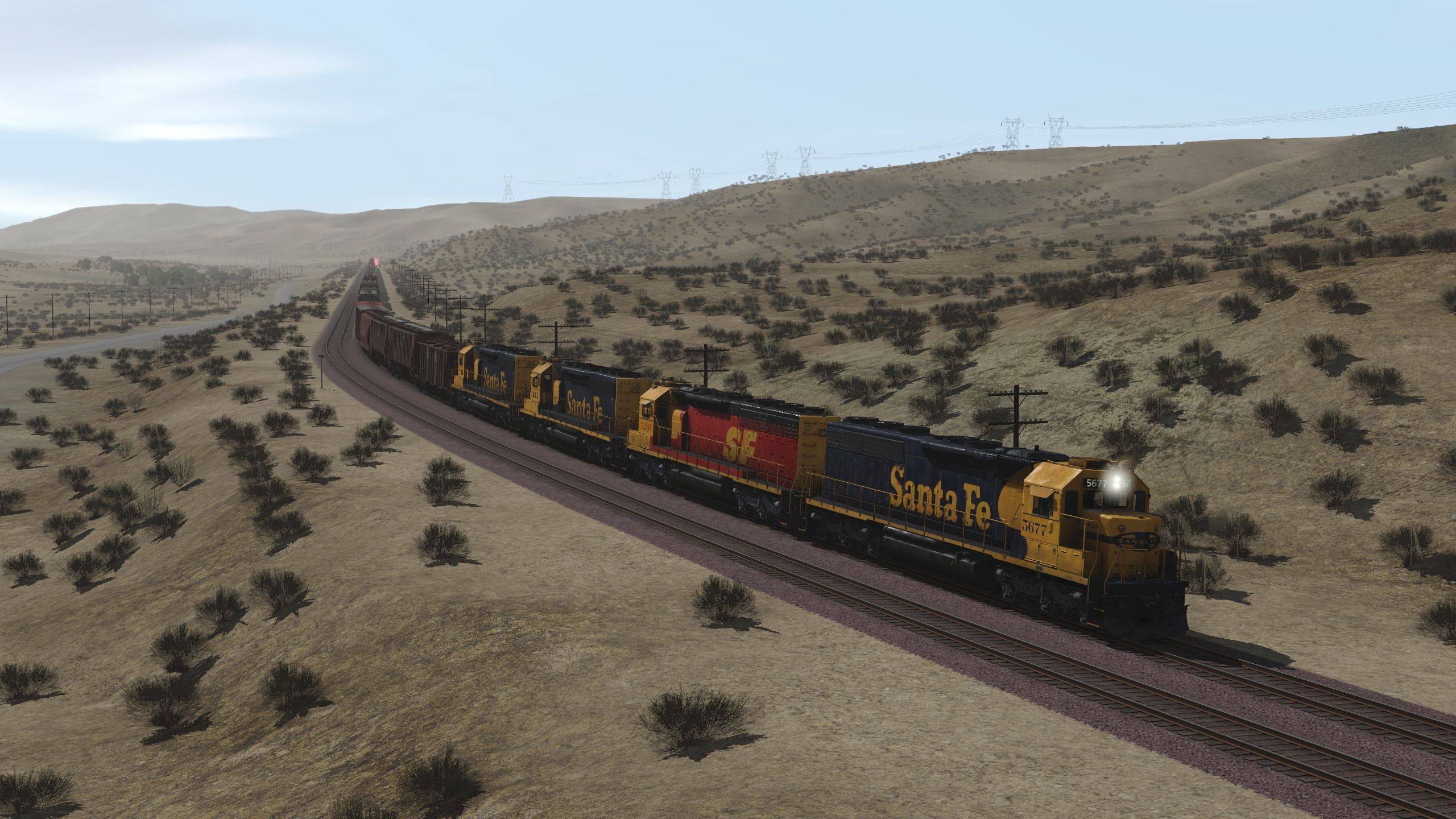 Tags: Trainz Railroad Simulator 2019, Cajon Subdivision - 1990 Part 1: The Pass, Default, ATSF SD45-2 blue/yellow warbonnet, ATSF SD45-2u (SPSF), ATSF SD40-2 2a 123 inch short hood, ATSF SD40-2 2a, ATSF LO 2893, ATSF LO 4750 3 Bay Covered Hopper, ATSF ACF Centerflow 3 Bay long hatch, RBOX P-S 50_6ft Boxcar, MP P-S 50_6ft Boxcar, MP GSC 60ft flatcar, SP 2 Bay Hopper ACF 2971