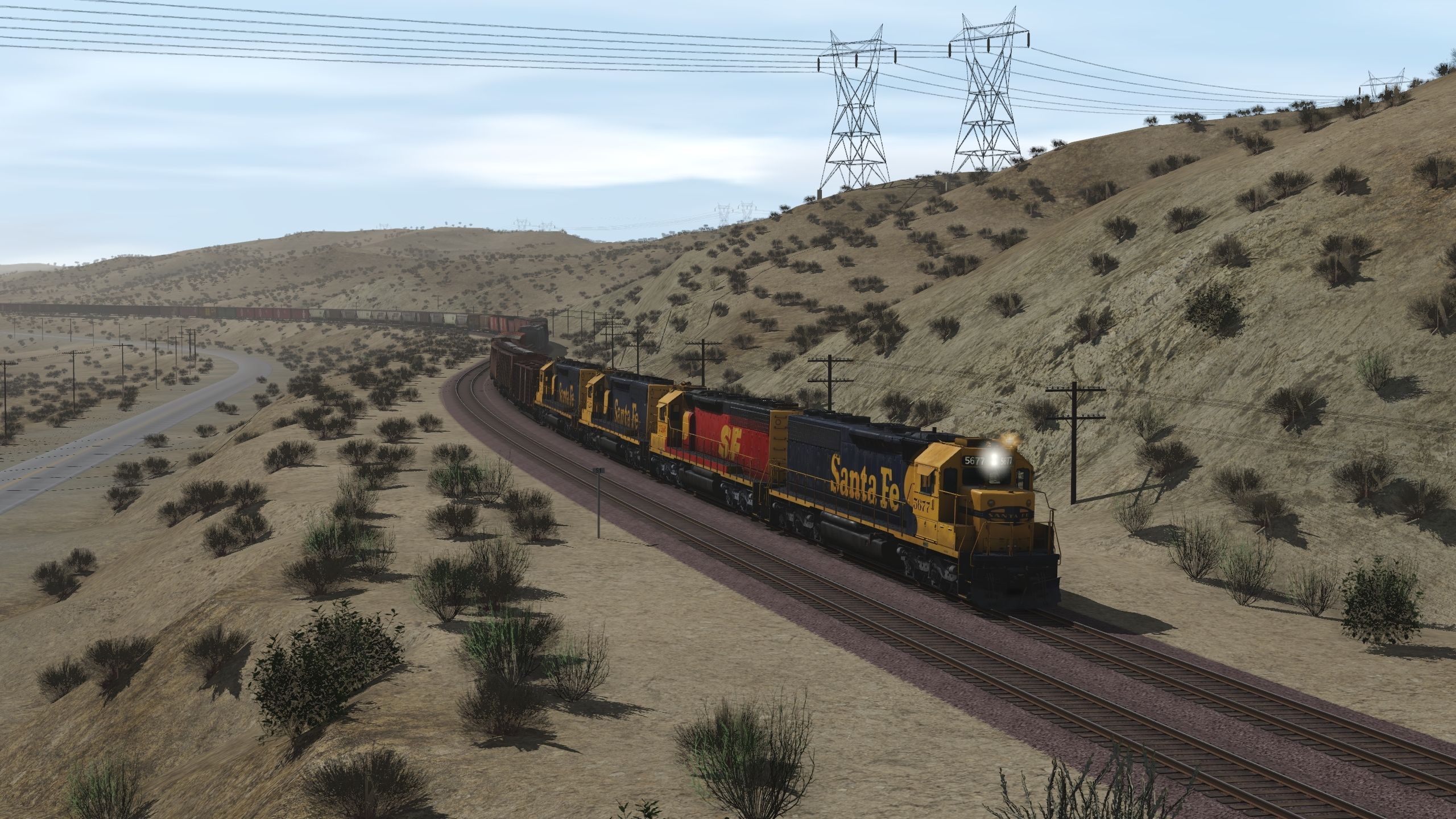 Tags: Trainz Railroad Simulator 2019, Cajon Subdivision - 1990 Part 1: The Pass, Default, ATSF SD45-2 blue/yellow warbonnet, ATSF SD45-2u (SPSF), ATSF SD40-2 2a 123 inch short hood, ATSF SD40-2 2a, ATSF LO 2893, ATSF LO 4750 3 Bay Covered Hopper, ATSF ACF Centerflow 3 Bay long hatch, RBOX P-S 50_6ft Boxcar, MP P-S 50_6ft Boxcar, MP GSC 60ft flatcar, SP 2 Bay Hopper ACF 2971