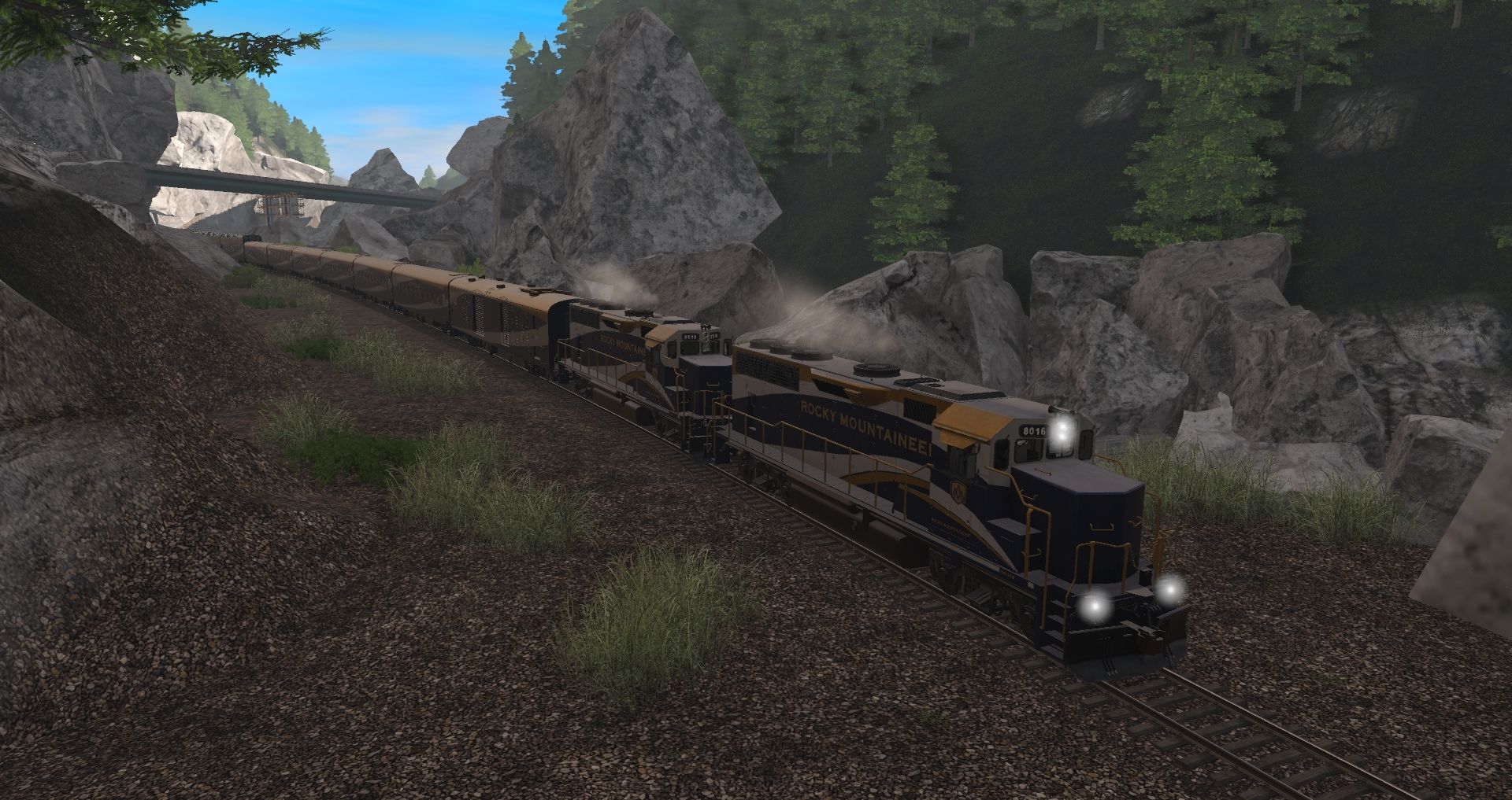 Tags: Trainz Railroad Simulator 2019, Canadian Rocky Mountains - Golden BC, 01 Rocky Mountaineer - Westbound Tourist, RMRX GP40-2, RMRX Baggage/Generator, RMRX 'Red Leaf' Coach, RMRX 'Silver Leaf' Glacier Dome, RMRX 'Gold Leaf' Ultra Dome