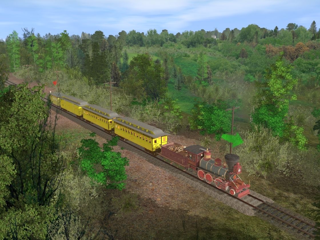 Tags: Trainz: A New Era, A _Black River & Utica RR, Default, V & T loco no 14 (Esmeralda) ca 1870's, V & T loco no 14 tender ca 1870's, V & T Coach No 3, V & T Baggage / Mail Car No 2, V & T Caboose No 6 yellow