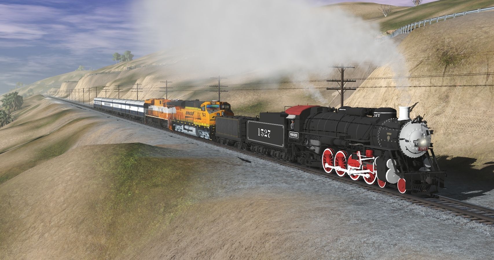 Tags: Trainz Railroad Simulator 2019, Quahog Sub v3.2, Quahog Sub V4 (PBR), Frisco 1527 Engine, BNSF ES44DC, VSR ES44AC Frisco Heritage Unit, Frisco 1527 Tender #2, Frisco 1522 Aux Tender, Frisco 1522 01 Tool Car Black Gold, Frisco 1522 02 Dorm Car Fire Fly, Frisco 1522 03 Lounge Chouteau Club, Frisco 1522 04 Business Tail Blue Bonnet