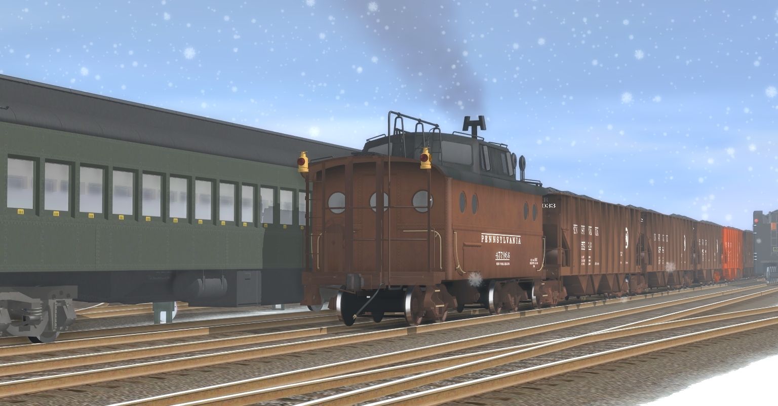 Tags: Trainz: A New Era, Branthorpe & Kilderdale Railway Snowy, Flying Cam, PRR I1sa Engine Post-War, Unlettered Pullman coach, PRR N5c Caboose 2, USA PRR Class S1 Tender, PRR GLa Hopper, PRR H21a Hopper, PRR I1sa Tender 90F82 Post-War