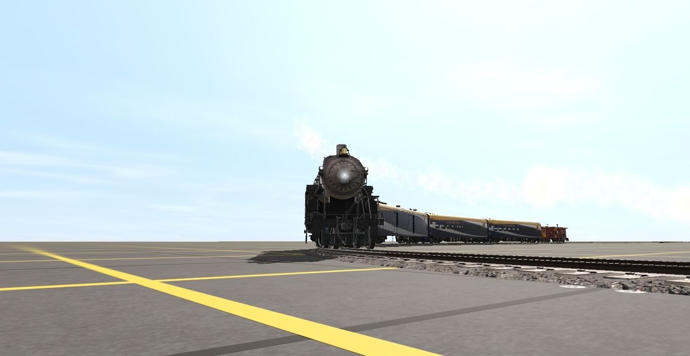 Tags: Trainz Railroad Simulator 2019, e, e - Default, USRA Light Pacific, USRA Light Pacific Tender, RMRX Baggage/Generator, RMRX 'Red Leaf' Coach, SP C50-9 Caboose