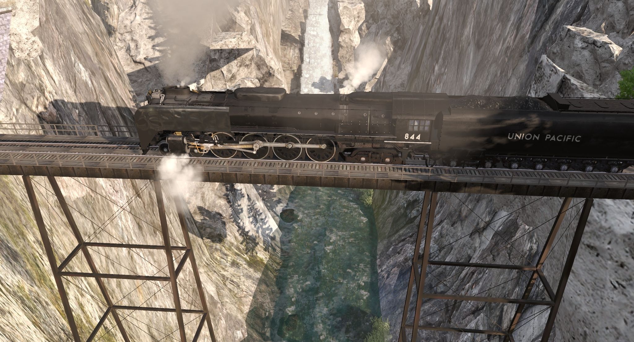 Posted by: Trainwizard09 | Posted:2020-12-25 21:40:58 Caption: UP 844 passing a river Tags: Trainz Railroad Simulator 2019, Matt Challenger Mountains2, Default