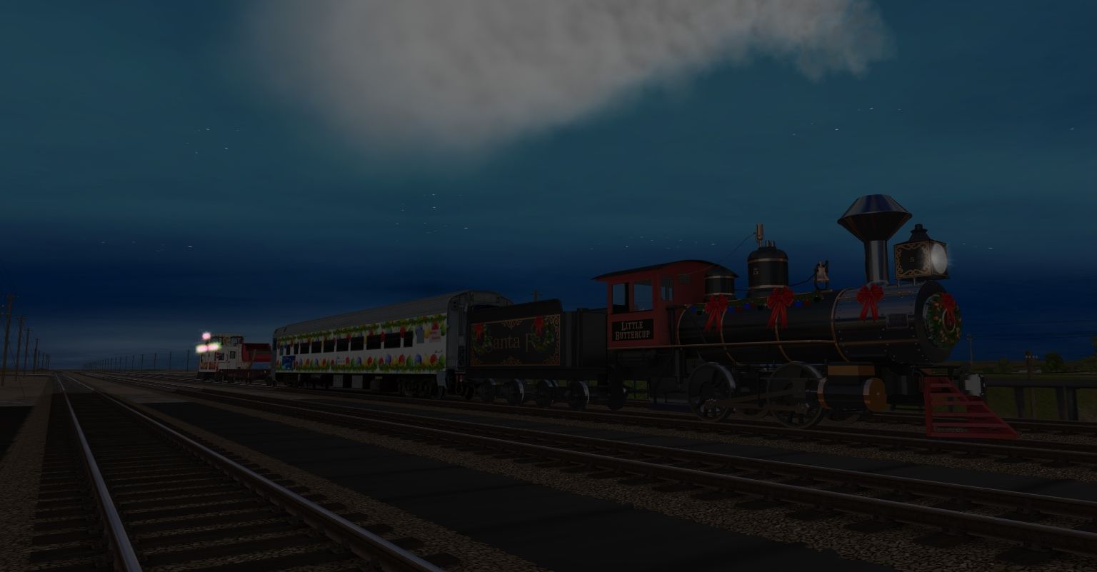 Tags: Trainz: A New Era, Sherman Hill vers 3.1, ATSF #5 'Little Buttercup' (Present Livery), ATSF #5 'Little Buttercup' Tender (Present Livery), Christmas Coach, Flatcar BNSF 60ft #917504 TS12, Christmas Caboose