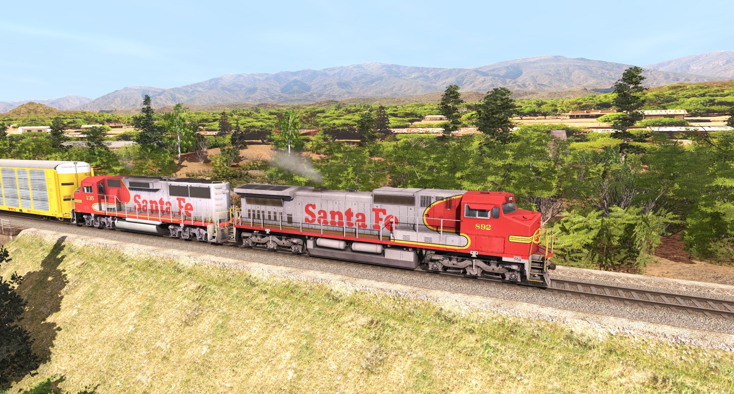Posted by: GIRAUD | Posted:2020-12-26 07:37:38 Caption: Tags: Trainz Railroad Simulator 2019, 000, ATSF C40-8W, ATSF GP60M, Autorack+ Tri-Level TTGX Canadian Pacific #