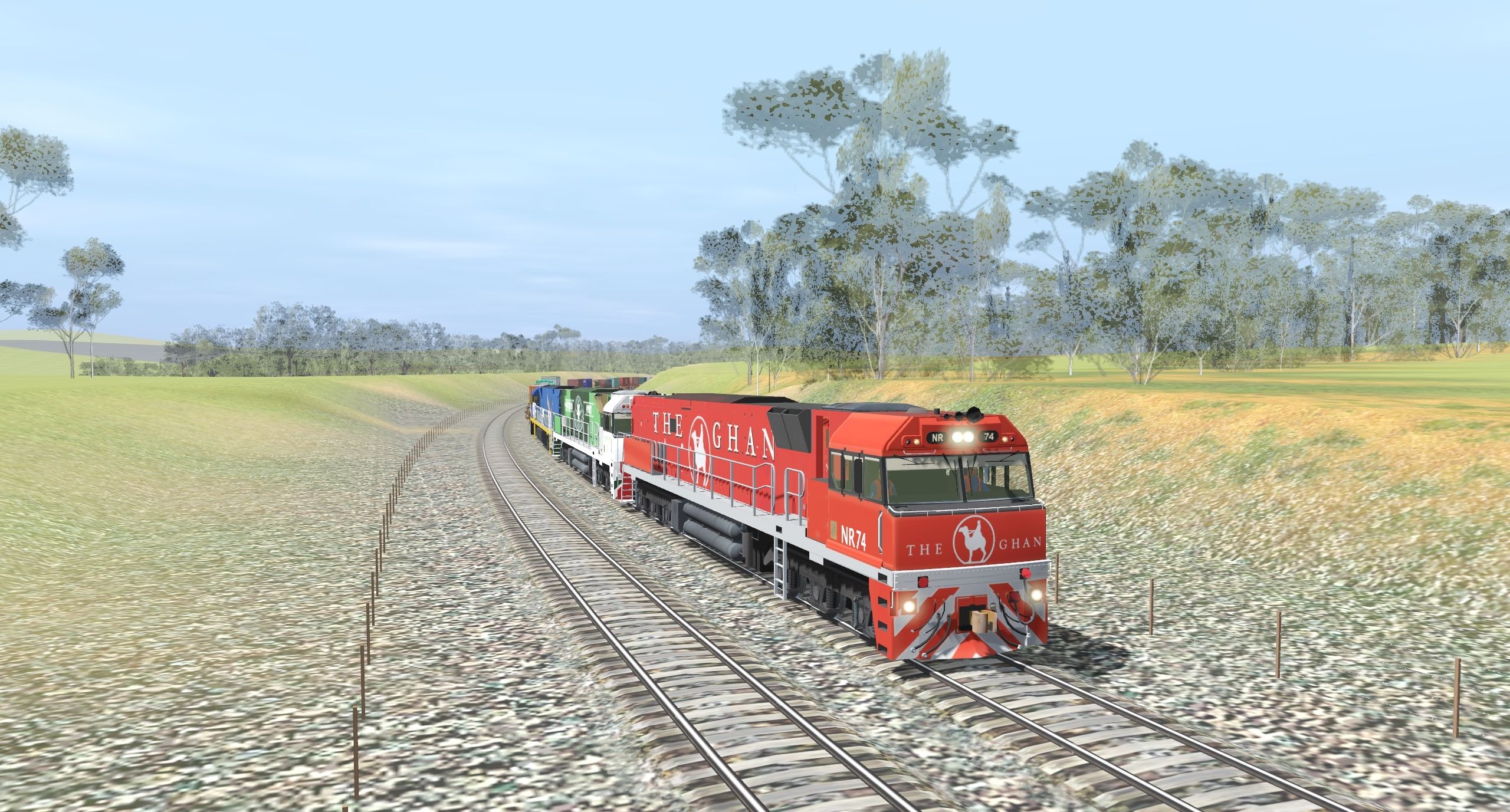 Tags: Trainz Railroad Simulator 2019, Picton 2 Goulburn, Default, NR class, NR Class Southern Spirit, NR Class Indian Pacific, NRC RKKY Flat - Coupler Version, NRC TQCY T1a 1998+, national rail 50ft flatcar, Pacific National RQZY Container Wagon (Middle Platform Single Stack)