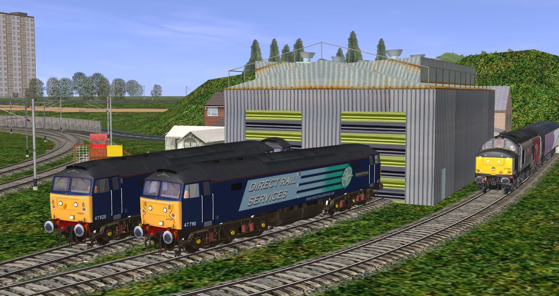 Tags: Trainz: A New Era, Flat grass and few buildings, DRS Blue 'Compass' Class 47, BR Class 37 37884 Europhoenix ROG logos, Mk1 BG Porterbrook barrier coach
