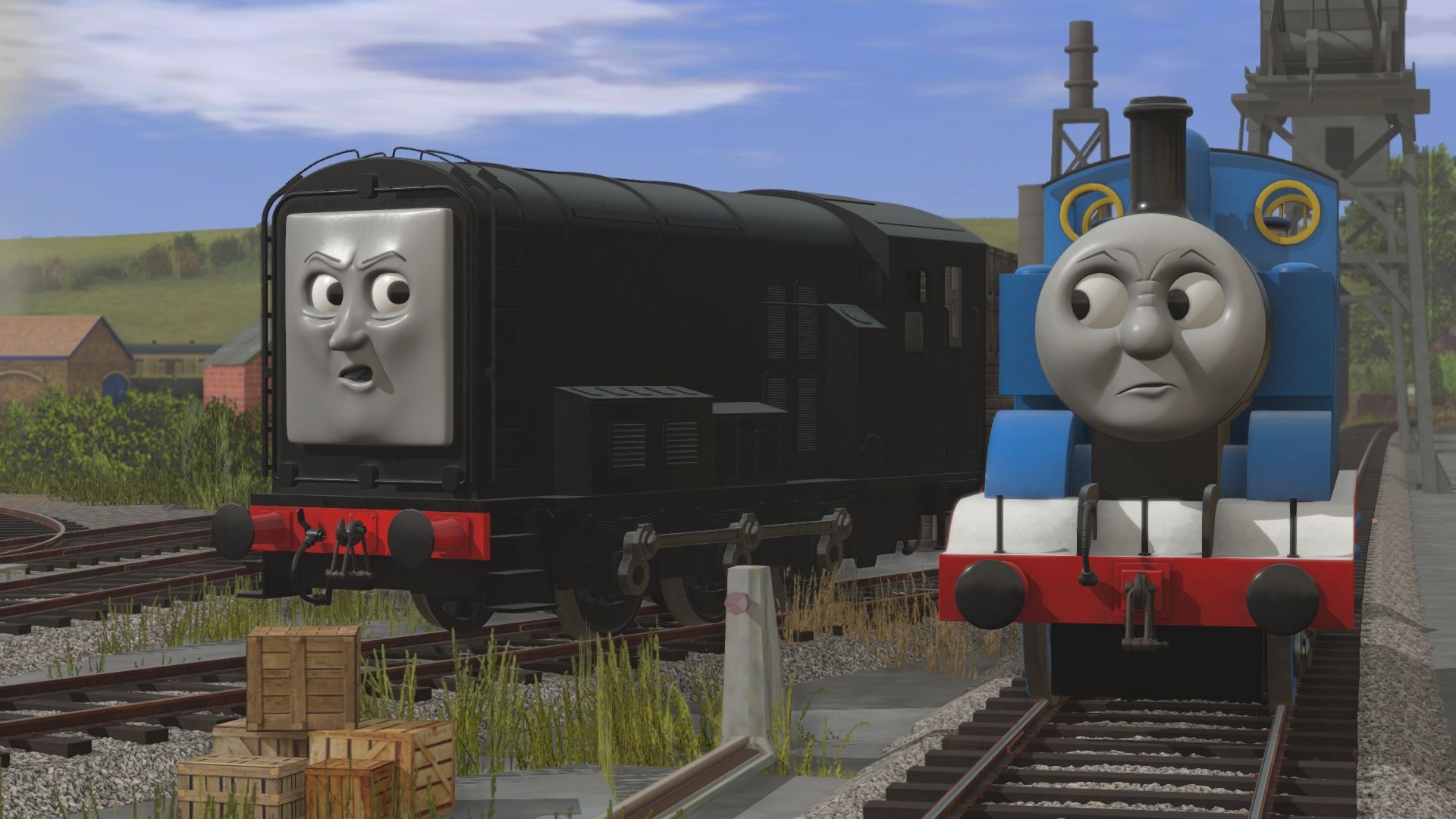 Tags: Trainz Railroad Simulator 2019, CGW PILOT Knapford Station - FarawayQuarry13, Default, Flying Cam, TTTE - Thomas The Tank Engine, TTTE - Devious Diesel, TTTE - Big City Engine, TRW - SR Pillbox Conflat (4 Poles), Engie's - TVS S6 Maunsell Composite Coach (TS19), Engie's - TVS S6 Maunsell Brake Coach (TS19), TTTE - Big City Engine's Tender
